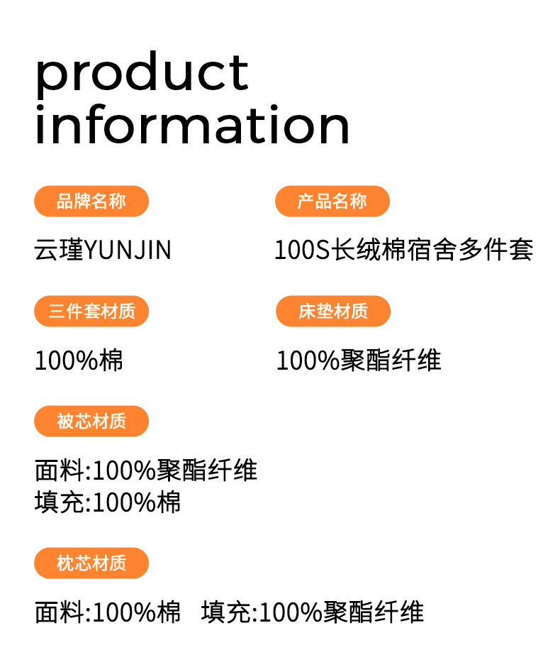 | Especificaciones de tamaño | 床单款:0.9床三件套(被套150x200+床单150x220+枕套),床单款:0.9床春秋丝绵五件套(床单三件套+枕芯+3斤大豆被),床单款:0.9床秋冬丝绵五件套(床单三件套+枕芯+5斤大豆被),床单款:0.9床春秋棉花五件套(床单三件套+枕芯+3斤棉花被),床单款:0.9床秋冬棉花五件套(床单三件套+枕芯+5斤棉花被),床单款:0.9床春秋丝绵六件套(床单三件套+枕芯+3斤大豆被+加厚床垫),床单款:0.9床秋冬丝绵六件套(床单三件套+枕芯+5斤大豆被+加厚床垫),床单款:0.9床春秋棉花六件套(床单三件套+枕芯+3斤棉花被+加厚床垫),床单款:0.9床秋冬棉花六件套(床单三件套+枕芯+5斤棉花被+加厚床垫),床笠款:0.9床三件套(被套150x200+床笠90x190+枕套),床笠款:0.9床春秋丝绵五件套(床笠三件套+枕芯+3斤大豆被),床笠款:0.9床秋冬丝绵五件套(床笠三件套+枕芯+5斤大豆被),床笠款:0.9床春秋棉花五件套(床笠三件套+枕芯+3斤棉花被),床笠款:0.9床秋冬棉花五件套(床笠三件套+枕芯+5斤棉花被),床笠款:0.9床春秋丝绵六件套(床笠三件套+枕芯+3斤大豆被+加厚床垫),床笠款:0.9床秋冬丝绵六件套(床笠三件套+枕芯+5斤大豆被+加厚床垫),床笠款:0.9床春秋棉花六件套(床笠三件套+枕芯+3斤棉花被+加厚床垫),床笠款:0.9床秋冬棉花六件套(床笠三件套+枕芯+5斤棉花被+加厚床垫),床单款:1.2床三件套(被套150x200+床单150x220+枕套),床单款:1.2床春秋丝绵五件套(床单三件套+枕芯+3斤大豆被),床单款:1.2床秋冬丝绵五件套(床单三件套+枕芯+5斤大豆被),床单款:1.2床春秋棉花五件套(床单三件套+枕芯+3斤棉花被),床单款:1.2床春秋棉花五件套(床单三件套+枕芯+5斤棉花被),床单款:1.2床春秋丝绵六件套(床单三件套+枕芯+3斤大豆被+加厚床垫),床单款:1.2床秋冬丝绵六件套(床单三件套+枕芯+5斤大豆被+加厚床垫),床单款:1.2床春秋棉花六件套(床单三件套+枕芯+3斤棉花被+加厚床垫),床单款:1.2床秋冬棉花六件套(床单三件套+枕芯+5斤棉花被+加厚床垫),床笠款:1.2床三件套(被套150x200+床笠120x200+枕套),床笠款:1.2床春秋丝绵五件套(床笠三件套+枕芯+3斤大豆被),床笠款:1.2床秋冬丝绵五件套(床笠三件套+枕芯+5斤大豆被),床笠款:1.2床春秋棉花五件套(床笠三件套+枕芯+3斤棉花被),床笠款:1.2床秋冬棉花五件套(床笠三件套+枕芯+5斤棉花被),床笠款:1.2床春秋丝绵六件套(床笠三件套+枕芯+3斤大豆被+加厚床垫),床笠款:1.2床秋冬丝绵六件套(床笠三件套+枕芯+5斤大豆被+加厚床垫) |