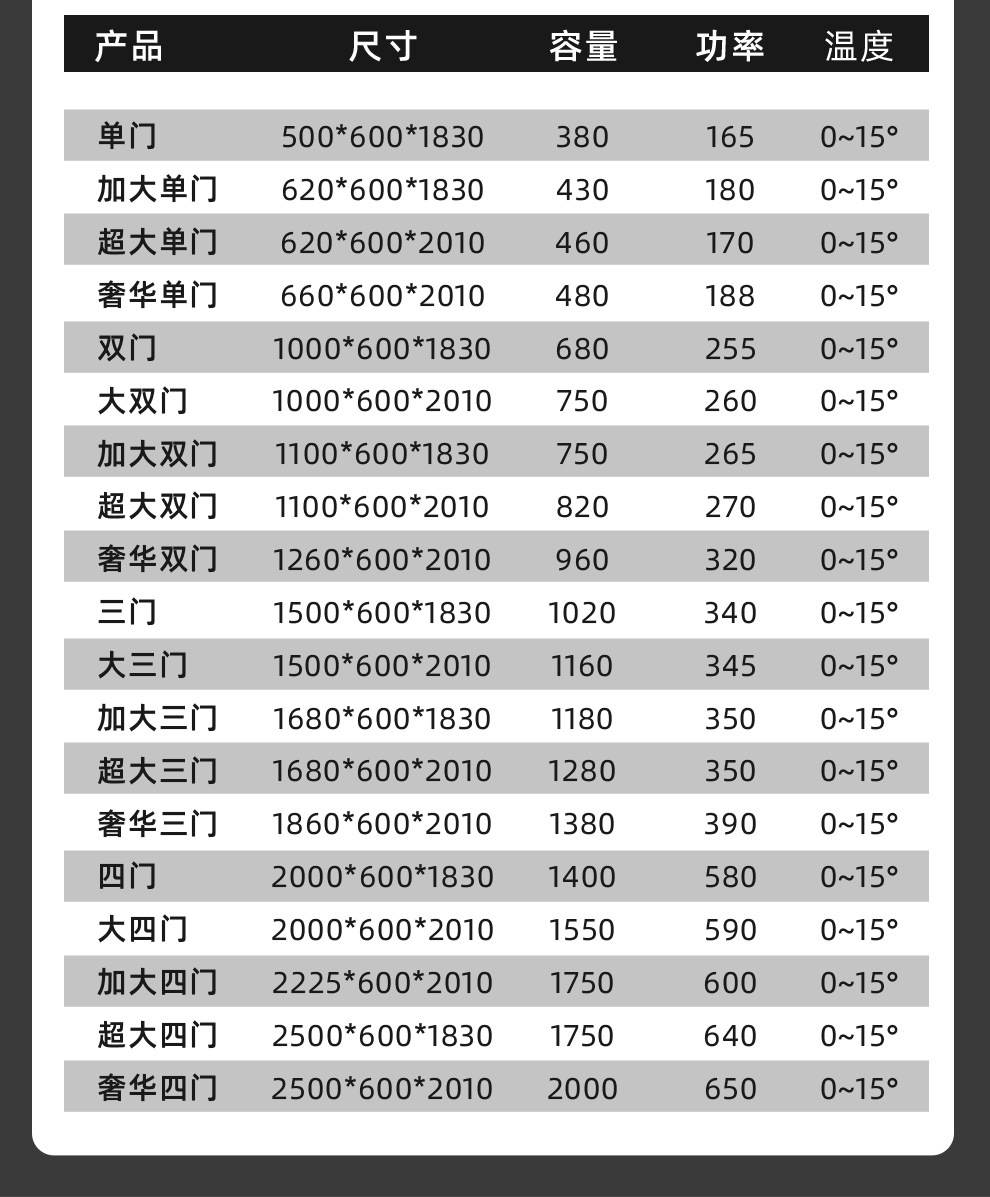 | Especificaciones | 单门500*600*1830mm,单门620*600*1830mm,双门1000*600*1830mm,双门1000*600*2010mm,双门1100*600*1830mm,双门1100*600*2010mm,双门1260*600*2010mm,三门1500*600*1830mm,三门1500*600*2010mm,三门1680*600*1830mm,三门1680*600*2010mm,三门1860*600*2010mm,四门2000*600*1830mm,四门2000*600*2010mm,四门2225*600*2010mm,四门2500*600*1830mm,四门2500*600*2010mm,无边框双门1000*600*1830mm,无边框双门1000*600*2010mm,无边框双门1100*600*1830mm,无边框双门1100*600*2010mm,无边框双门1260*600*2010mm,无边框三门1500*600*1830mm,无边框三门1500*600*2010mm,无边框三门1680*600*1830mm,无边框三门1680*600*2010mm,无边框三门1860*600*2010mm,无边框四门2000*600*1830mm,无边框四门2000*600*2010mm,无边框四门2225*600*2010mm,无边框四门2500*600*1830mm,无边框四门2500*600*2010mm,除雾双门1000*600*1830mm,除雾双门1000*600*2010mm,除雾双门1100*600*1830mm,除雾双门1100*600*2010mm,除雾双门1260*600*2010mm,除雾三门1500*600*1830mm,除雾三门1500*600*2010mm,除雾三门1680*600*1830mm,除雾三门1680*600*2010mm,除雾三门1860*600*2010mm,除雾四门2000*600*1830mm,除雾四门2000*600*2010mm,除雾四门2225*600*2010mm,除雾四门2500*600*1830mm,除雾四门2500*600*2010mm |
