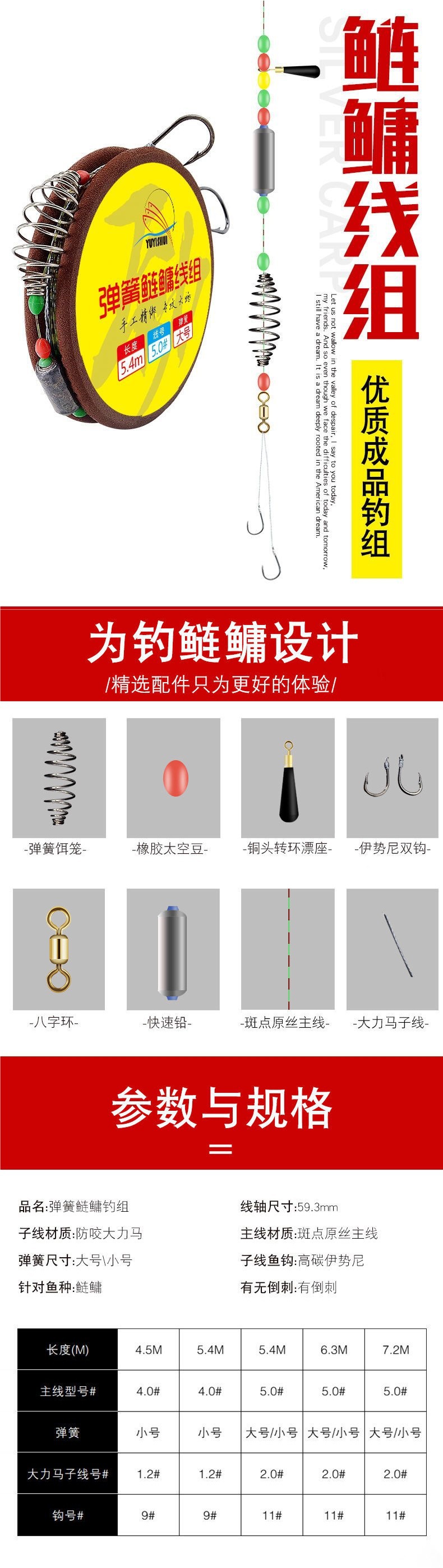 | Especificaciones | 4,5 metros de línea principal 4,0 ¿ 4,4 metros de línea principal 4,0 ¿ 5,4 metros de línea principal 5,0 ¿ 5,0 ¿ 5,0 ¿ 5,0 ¿ 6,3 metros de línea principal 5,0 ¿ 6,3 metros de línea principal 5,0 ¿ 6,3 metros de línea principal 5,0 ¿ 6,2 metros de línea principal 5,0 ¿ 7,2 metros de línea principal 5,0 ¿ 7,2 metros de línea principal 5,0 ¿ 7,2 metros de línea principal 5,0 ¿ 7,2 metros de línea principal (resorte grande) |