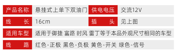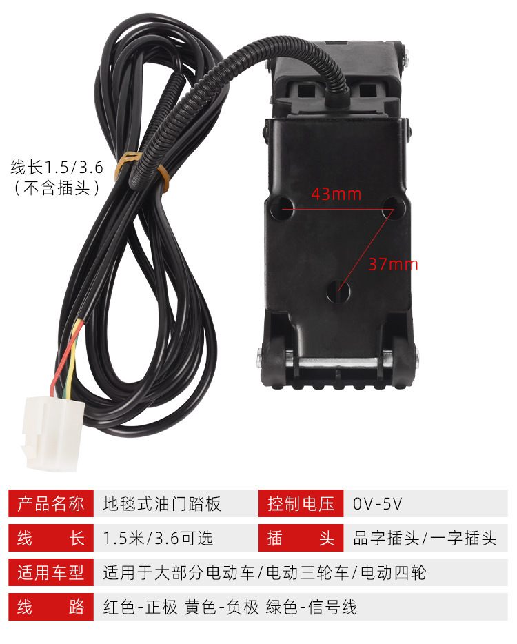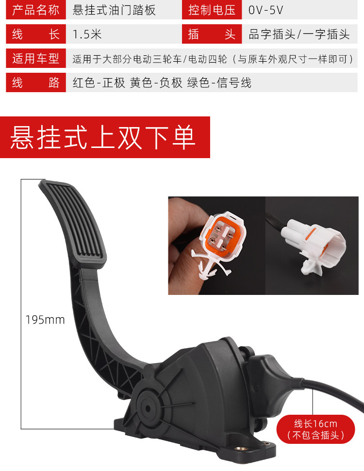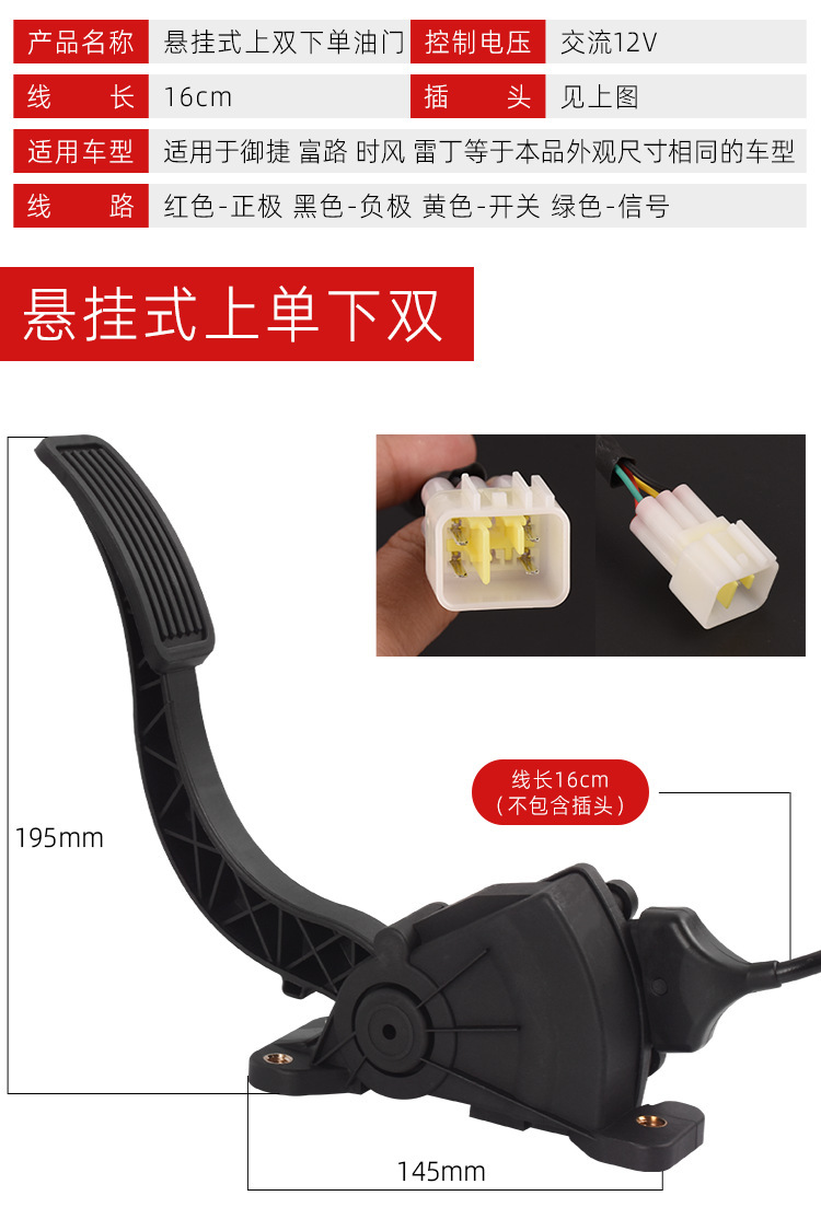 | Especificaciones de embalaje | Pedal de aceleración de alambre de 1,5 metros con enchufe de una sola palabra tipo alfombra (enviar tornillos),Pedal de aceleración de alambre de 1,5 metros con enchufe tipo alfombra (enviar tornillos),Pedal de aceleración de línea de 3,6 metros con enchufe de una sola palabra tipo alfombra (enviar tornillos),Pedal de aceleración de línea de 3,6 metros con enchufe tipo alfombra (enviar tornillos),Pedal de aceleración de línea de 1,5 metros con enchufe de una sola palabra colgante,Pedal de aceleración de línea de 1,5 metros con enchufe de carácter colgante,Pedal de aceleración de 4 líneas en doble orden con orificio colgante,Pedal de aceleración de 4 hilos superior e inferior doble con orificio colgante |