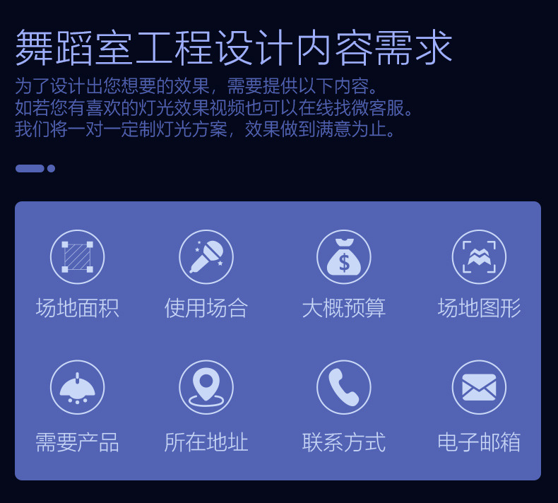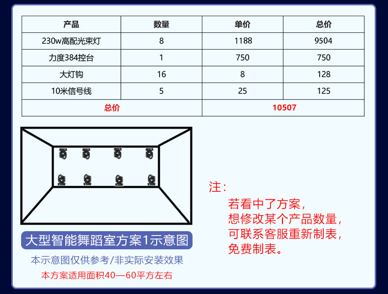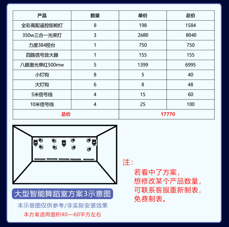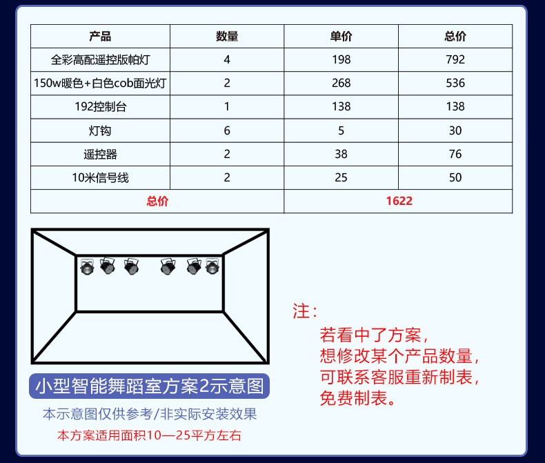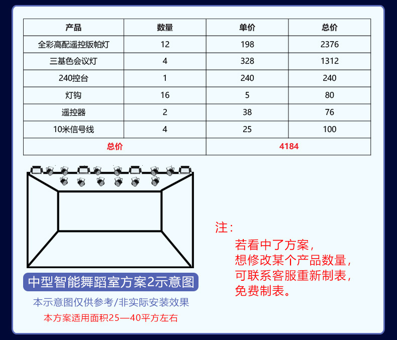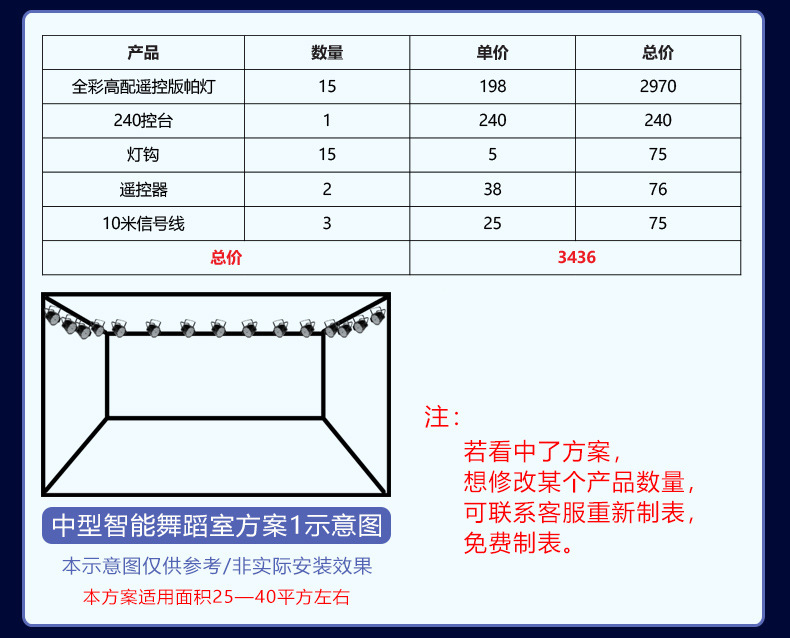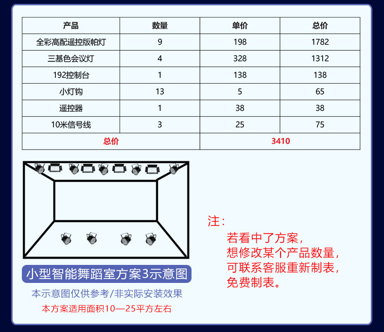 | Especificaciones | Solución pequeña 1 (aplicable a 10-25 metros cuadrados),Solución pequeña 2 (aplicable a 10-25 metros cuadrados),Solución pequeña 3 (aplicable a 10-25 metros cuadrados),Solución media 1 (25-40 metros cuadrados aplicables),Solución media 2 (25-40 metros cuadrados aplicables),Solución media 3 (aplicable a 25-40 metros cuadrados),Escenario grande 1 (40-60 cuadrados),Solución grande 2 (40-60 metros cuadrados aplicables),Solución grande 3 (aplicable a 40-60 metros cuadrados),Diseño de esquema de iluminación de Estudio de danza |
