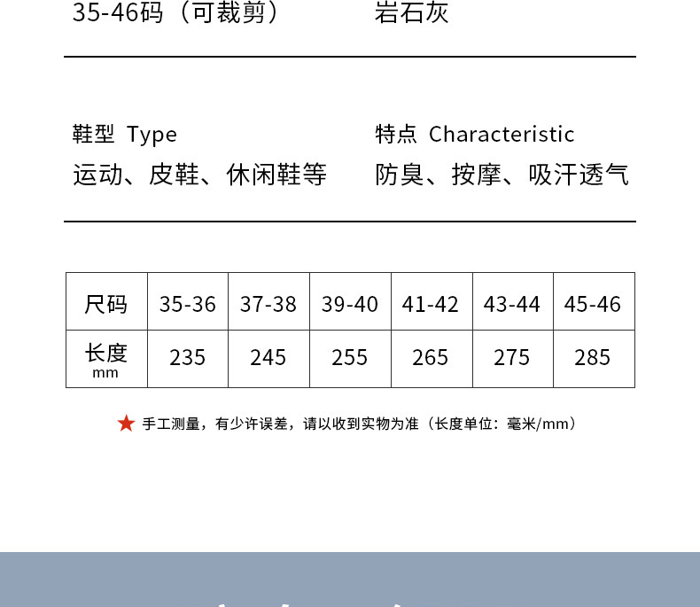 | tamaño | 35-36 [se puede cortar],37-38 [se puede cortar],39-40 [se puede cortar],41-42 [se puede cortar],43-44 [se puede cortar],45-46 [se puede cortar] |