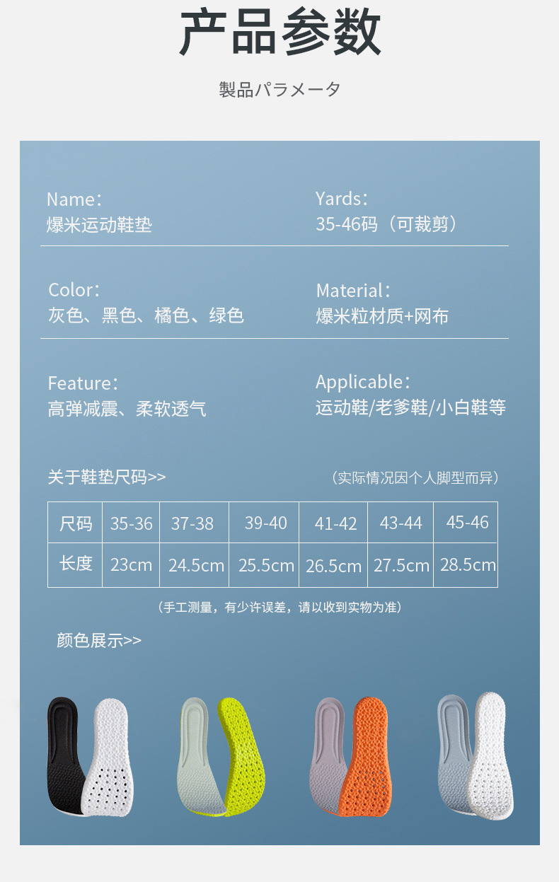 | Talla | 35-36 【Se puede cortar】,37-38 【Se puede cortar】,39-40 【Se puede cortar】,41-42 【Se puede cortar】,43-44 【Se puede cortar】,45-46 【Se puede cortar】 |