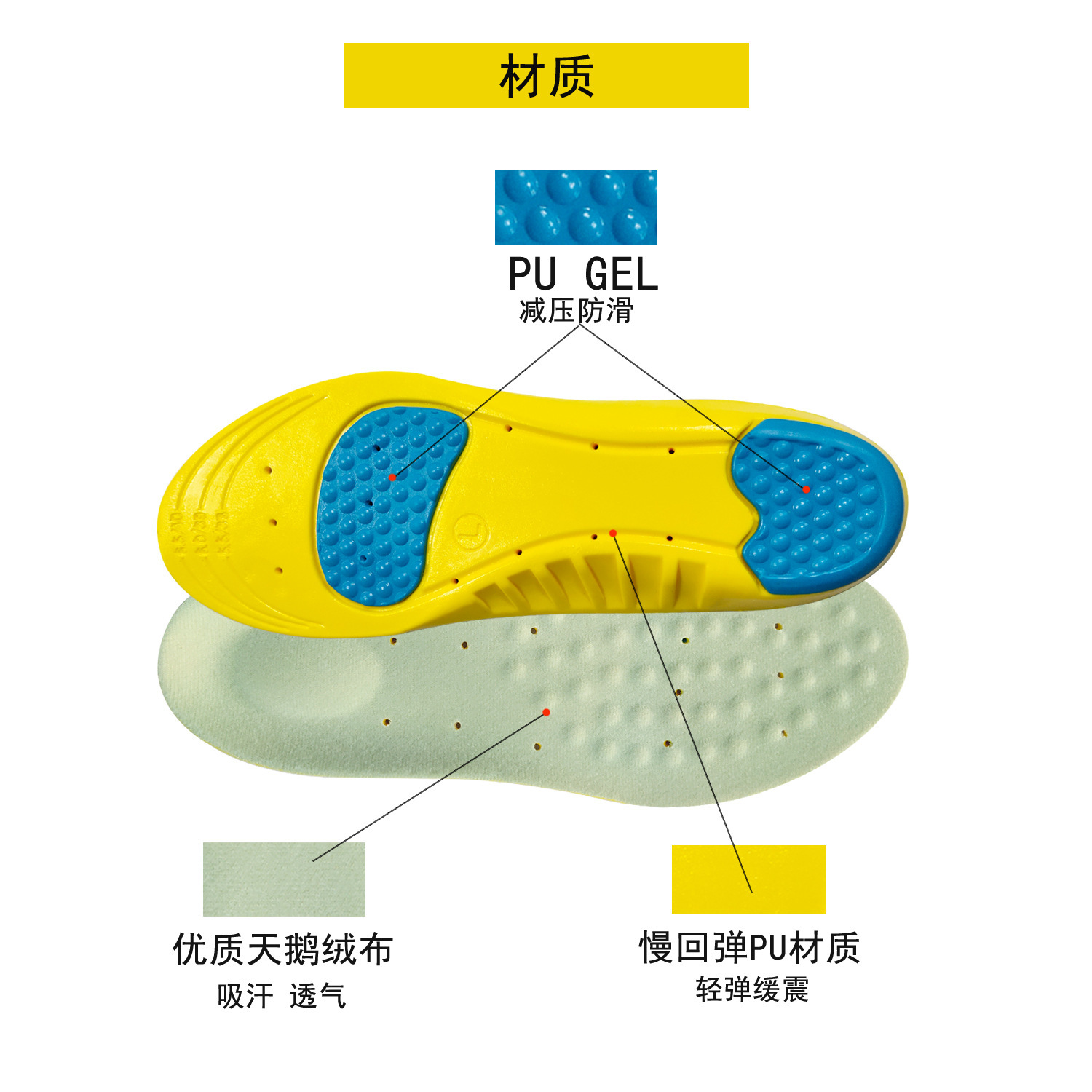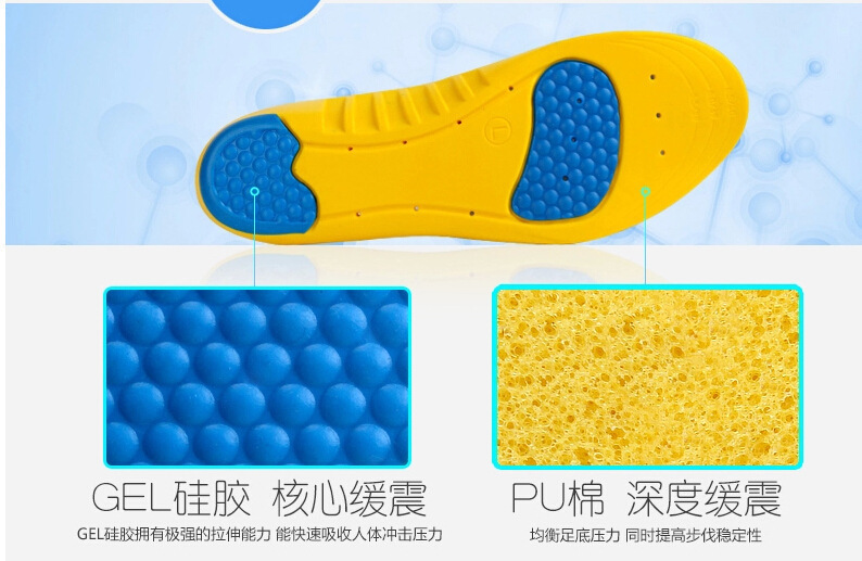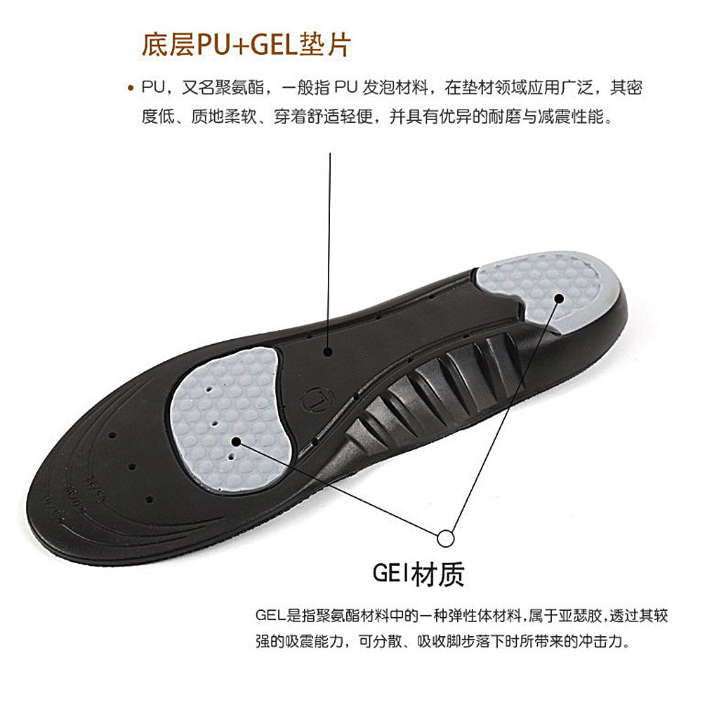 鞋垫材质:GEL+PU+天鹅绒布