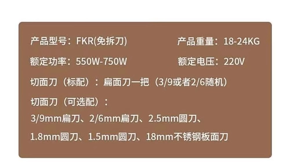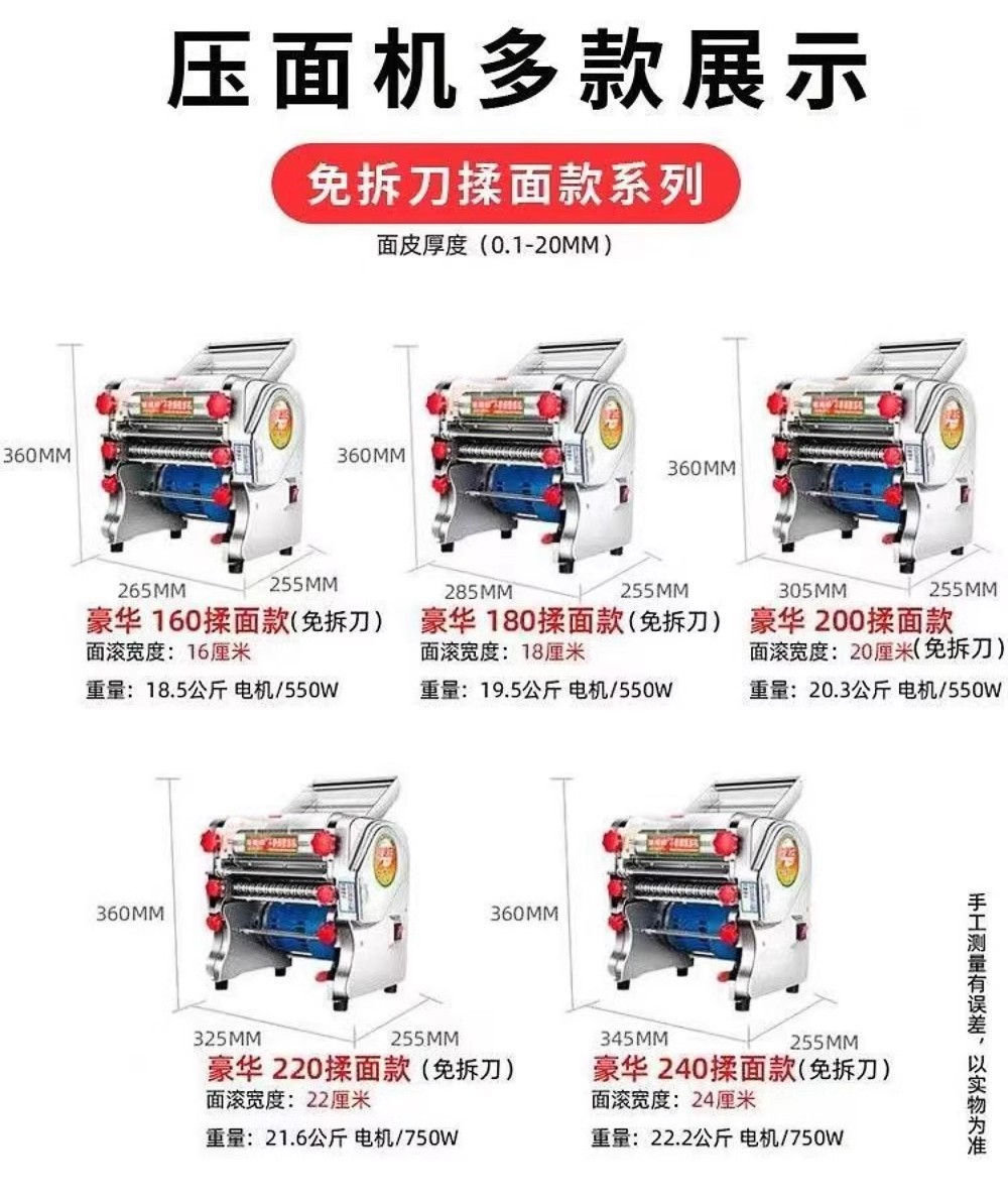 | Especificaciones | FKR - 160 cuchillo sin desmontaje + motor de alta potencia 550W +(0.1-20MM de piel prensada), cuchillo libre FKR-180 + motor de alta potencia de 550W +(0.1-20MM de piel prensada), cuchillo libre FKR - 200 + motor de alta potencia de 550W +(0.1-20MM de piel prensada), cuchillo libre FKR-220 + motor de alta potencia de 750W +(0.1-20MM de piel prensada), cuchillo libre FKR-240 + motor de alta potencia de 750W +(0.1-20MM de piel prensada), FKR - 160 máquina de masa de lujo + motor de alta potencia de 550W +(0.1-20MM de piel prensada, FKR-180 de lujo amasadora + 550W motor de alta potencia + (0.1-20MM de piel prensada, FKR - 200 de lujo amasadora + 550W motor de alta potencia + (0.1-20MM de piel prensada, FKR-220 de lujo amasadora + 750W motor de alta potencia + (0.1-20MM de piel prensada, FKR-240 máquina de amasado de lujo + 750W motor de alta potencia + (0.1-20MM, prensa de masa de lujo FKM-160 + 550W motor de alta potencia + (0.1-5MM), prensa de masa de lujo FKM-180 + 550W motor de alta potencia (0.1-5MM), prensa de fideos de lujo FKM-200 + motor de alta potencia de 550W +(0.1-5MM), prensa de fideos de lujo FKM-220 + motor de alta potencia de 750W +(0.1-5MM), prensa de fideos de lujo FKM - 240 + motor de alta potencia de 750W +(0.1-5MM de piel prensada), FKR-180 cuchillo libre de desmontaje + 750 motor de cobre puro + (0.1-20MM de piel prensada), FKR-200 cuchillo libre de desmontaje + 750 motor de cobre puro + (0.1-20MM de piel prensada), FKR-220 cuchillo libre de desmontaje + 750 motor de cobre puro + (0.1-20MM de piel prensada), FKR-240 cuchillo libre de desmontaje + 750 motor de cobre puro + (0.1-20MM de piel prensada) |