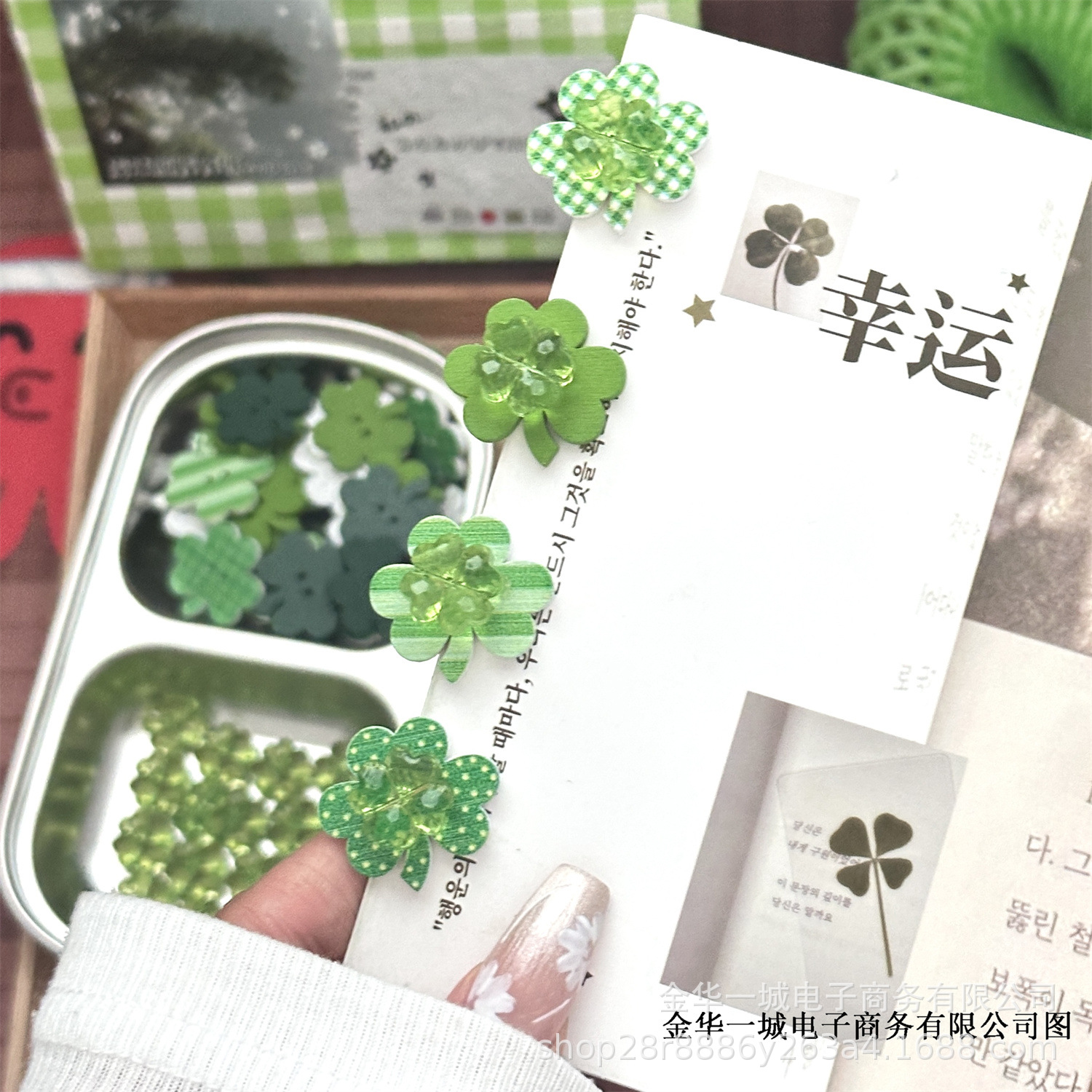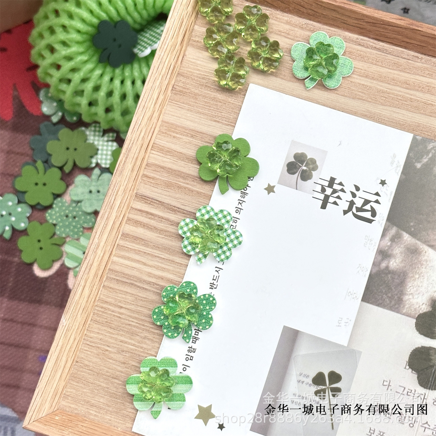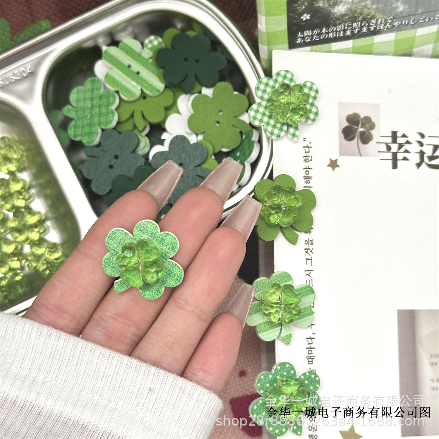 | Colores | Accesorios transparentes de trébol de cuatro hojas,Accesorios Trébol de cuatro hojas verde,Mezcla y combina accesorios de trébol de cuatro hojas de colores,Accesorios acolchados de trébol de cuatro hojas (varios tipos de mezcla y combinación),Clip de trébol de cuatro hojas,Mezcla y combinación de piezas de madera de trébol de cuatro hojas,Cinta de trébol de cuatro hojas (5m/rollo) Ancho 15mm |