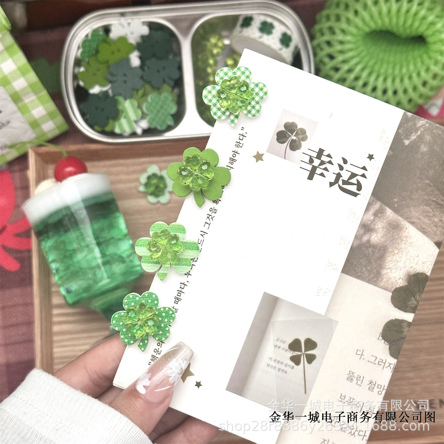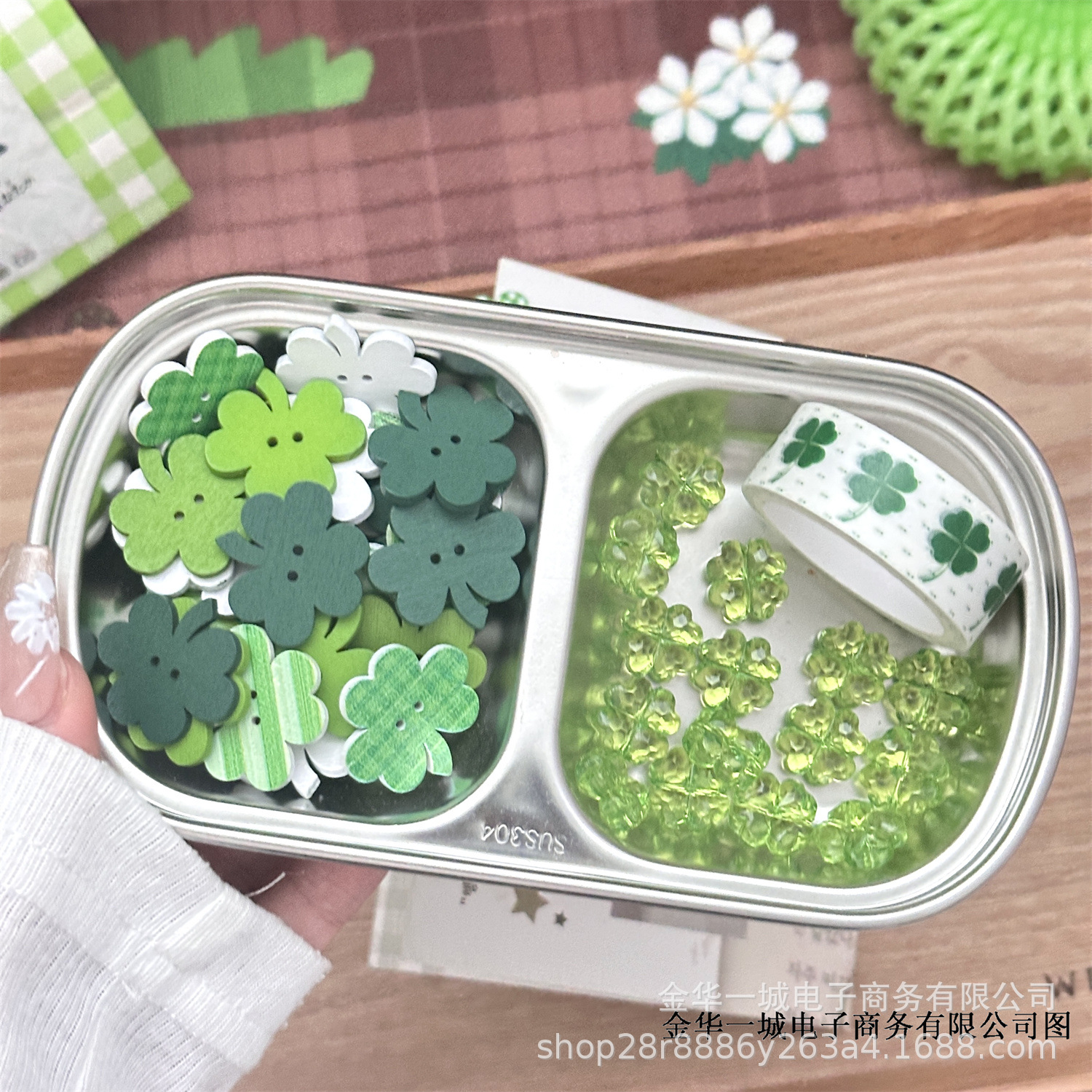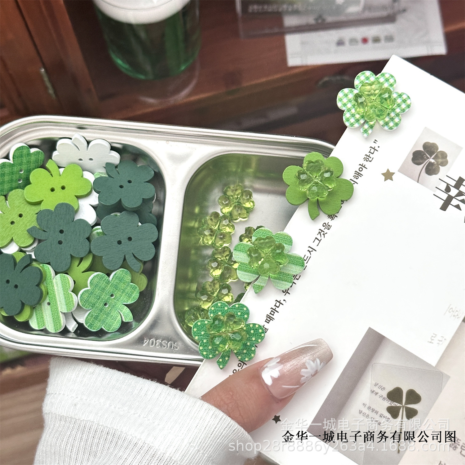 | Colores | Accesorios transparentes de trébol de cuatro hojas,Accesorios Trébol de cuatro hojas verde,Mezcla y combina accesorios de trébol de cuatro hojas de colores,Accesorios acolchados de trébol de cuatro hojas (varios tipos de mezcla y combinación),Clip de trébol de cuatro hojas,Mezcla y combinación de piezas de madera de trébol de cuatro hojas,Cinta de trébol de cuatro hojas (5m/rollo) Ancho 15mm |