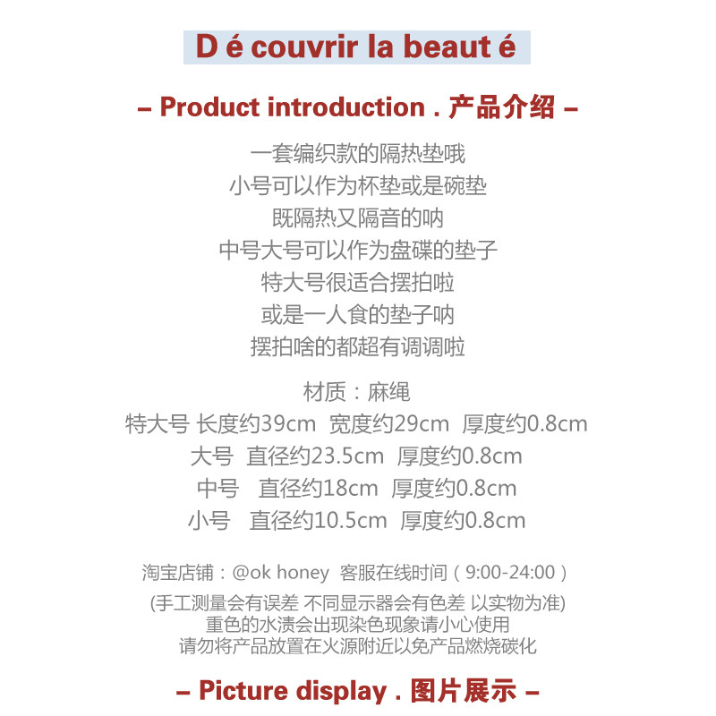| Colores | Estera tejida de yute 30*40cm,Estera tejida de yute 36cm,Estera tejida de yute 30cm,Estera tejida de yute 24cm,Estera tejida de yute 18cm,Estera tejida de yute 11cm,Estera tejida de yute 33cm |