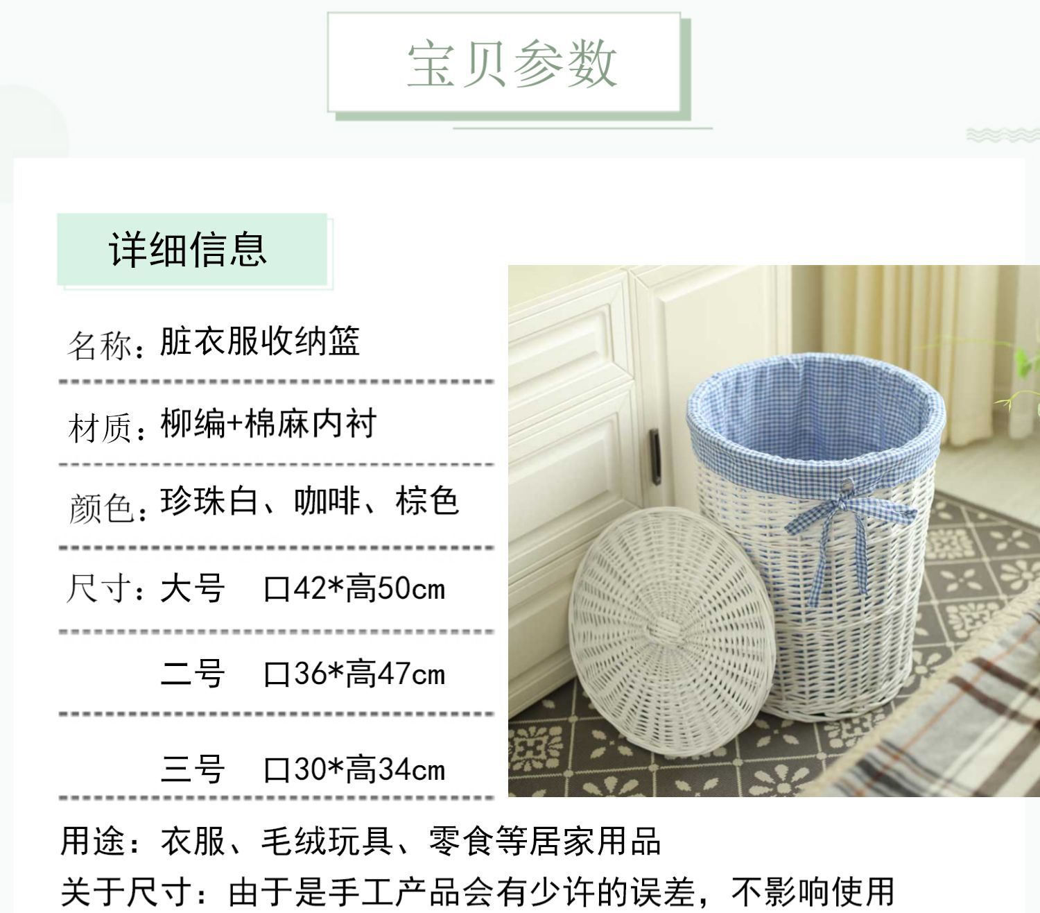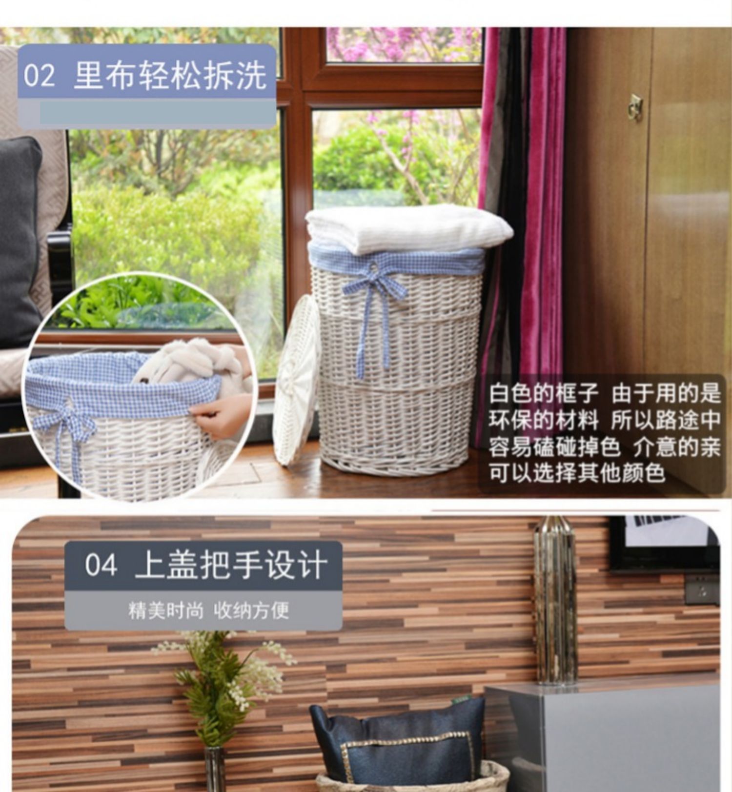 | Color | Cesta de almacenamiento blanca (con tapa),Cesta de almacenamiento marrón (con tapa),Cesta de almacenamiento de miel (con tapa),Color primario sin pintar (con cubierta),Tejido único (sin cesta) |