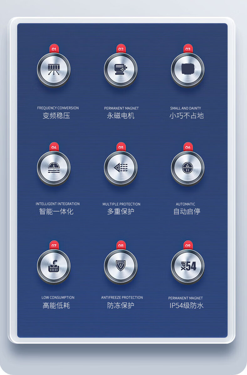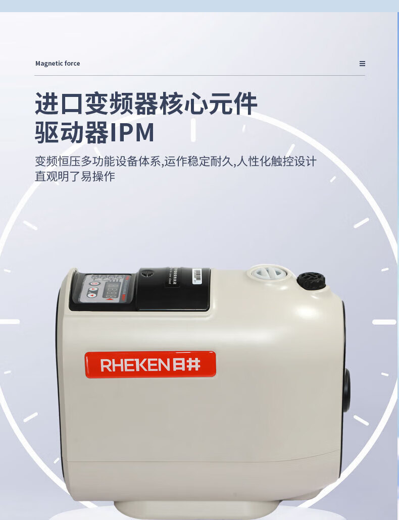 | Especificaciones | R2-20 [bomba de refuerzo de conversión de frecuencia de imán permanente de 400W],R2-30 [bomba de refuerzo de frecuencia variable de imán permanente de 600W],R2-30 [600W imán permanente inversor WiFi] |