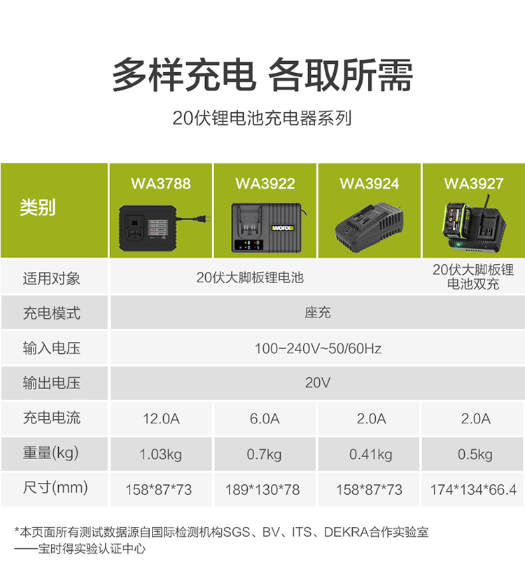 WA3927 [20V 2A doble carga], WA3922 [20V 6A flash carga], WA3788 [20V 12A súper flash carga], WA3924 [20V 2A carga rápida]
