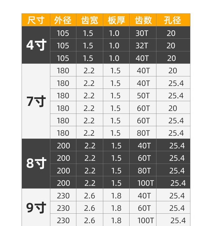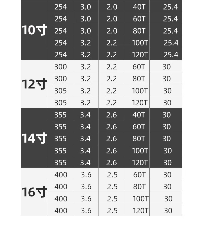 | Especificaciones | 105x1.5x30Tx20交替齿【4英寸】,105x1.5x32Tx20埋入齿【4英寸】,105x1.5x40Tx20交替齿【4英寸】,180x2.2x40Tx20交替齿【7英寸】,180x2.2x40Tx25.4交替齿【7英寸】,180x2.2x50Tx25.4交替齿【7英寸】,180x2.2x60Tx20交替齿【7英寸】,180x2.2x60Tx25.4交替齿【7英寸】,180x2.2x80Tx25.4交替齿【7英寸】,200x2.2x40Tx25.4交替齿【8英寸】,200x2.2x60Tx25.4交替齿【8英寸】,200x2.2x80Tx25.4交替齿【8英寸】,200x2.2x100Tx25.4交替齿【8英寸】,230x2.6x40Tx25.4交替齿【9英寸】,230x2.6x60Tx25.4交替齿【9英寸】,230x2.6x80Tx25.4交替齿【9英寸】,230x2.6x100Tx25.4交替齿【9英寸】,254x3.0x40Tx25.4交替齿【10英寸】,254x3.0x60Tx25.4交替齿【10英寸】,254x3.0x80Tx25.4交替齿【10英寸】,254x3.2x100Tx25.4交替齿【10英寸】,254x3.2x120Tx25.4交替齿【10英寸】,300x3.2x40Tx25.4交替齿【12英寸】,300x3.2x60Tx25.4交替齿【12英寸】,300x3.2x80Tx25.4交替齿【12英寸】,305x3.2x100Tx30交替齿【12英寸】,305x3.2x120Tx30交替齿【12英寸】,355x3.4x40Tx30交替齿【14英寸】,355x3.4x60Tx30交替齿【14英寸】,355x3.4x80Tx30交替齿【14英寸】,355x3.4x100Tx30交替齿【14英寸】,355x3.4x120Tx30交替齿【14英寸】,400x3.6x60Tx30交替齿【16英寸】,400x3.6x80Tx30交替齿【16英寸】,400x3.6x100Tx30交替齿【16英寸】,400x3.6x120Tx30交替齿【16英寸】 |