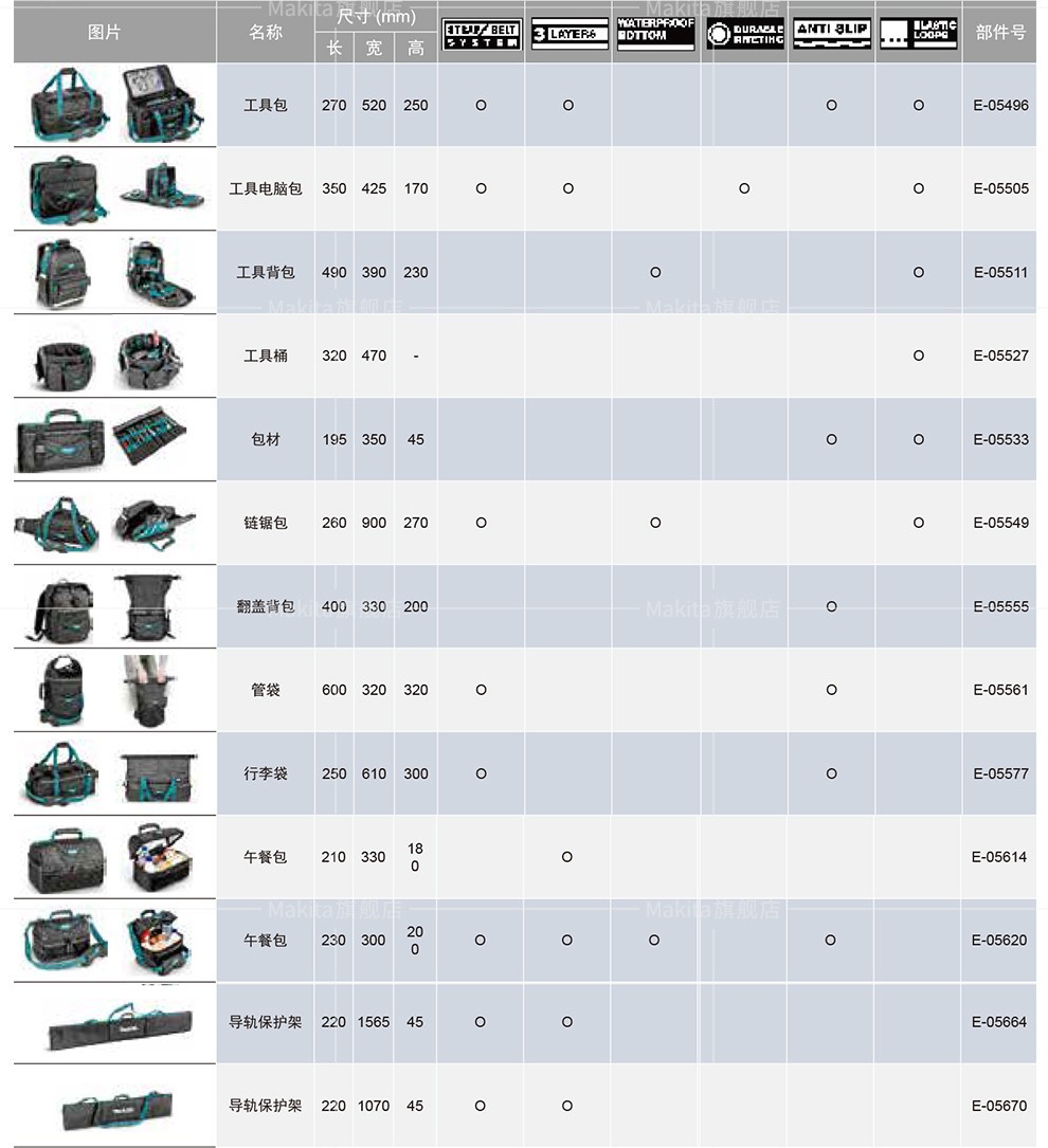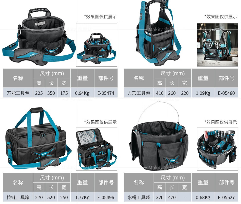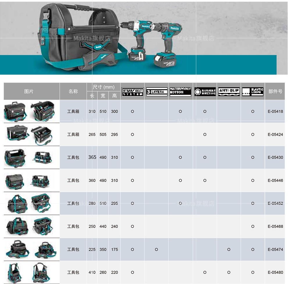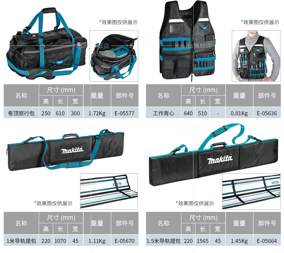 | Especificaciones y modelos | Kit de herramientas ajustable de pastoral E - 05418, Kit de herramientas de apertura de pastoral (nuevo) E - 05430, Kit de herramientas de tapa de pastoral E - 05446, Kit de herramientas de boca ancha de pastoral E - 05468, Kit de herramientas de tres vías de pastoral E - 05474, Kit de herramientas de cuatro caras de pastoral E - 05480, Kit de herramientas de semi-rigido de pastoral E - 05496, Barril de herramientas de pastoral E - 05527, Kit de acabado de herramientas de pastoral E - 05533, Paquete de cadena de pastoral E - 05549, Mochila de flip-top Makida E - 05555, bolso de tubo de flip-top Makida E - 05561, bolso de equipaje de flip-top Makida E - 05577, chaleco de trabajo ajustable Makida E - 05636, marco de protección de riel de guía Makida E - 05664, marco de protección de riel de guía Makida 1M E - 05670 |
