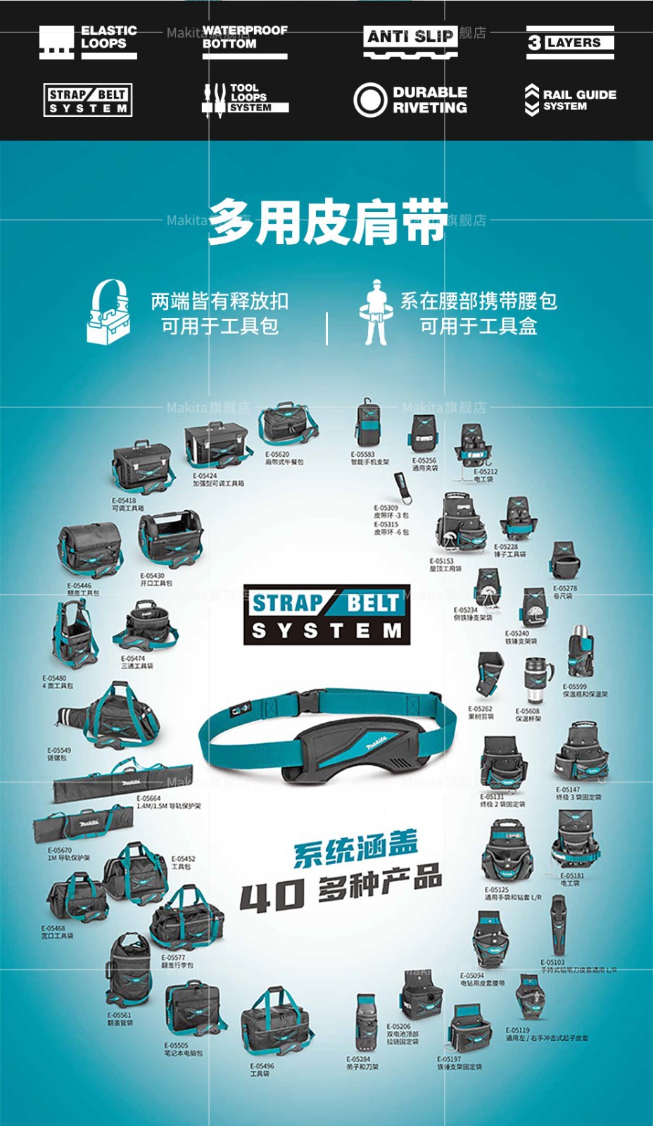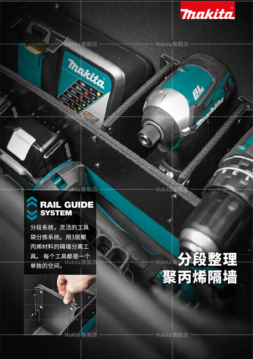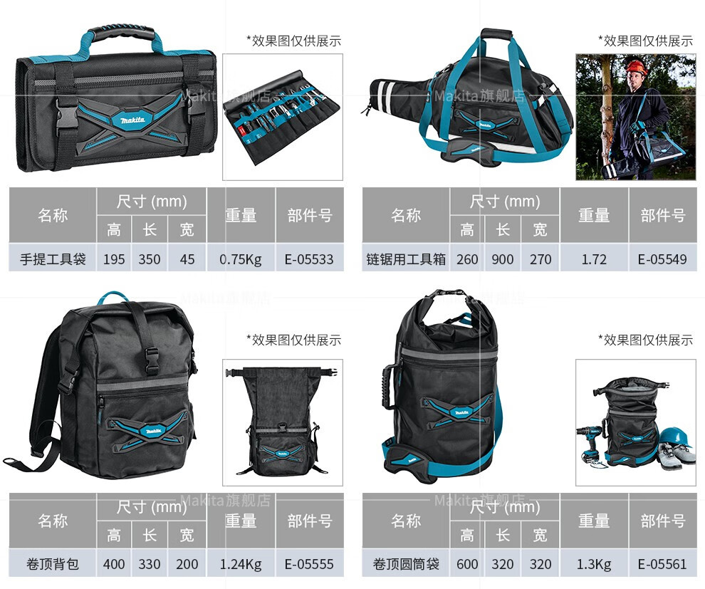 | Especificaciones y modelos | Kit de herramientas ajustable de pastoral E - 05418, Kit de herramientas de apertura de pastoral (nuevo) E - 05430, Kit de herramientas de tapa de pastoral E - 05446, Kit de herramientas de boca ancha de pastoral E - 05468, Kit de herramientas de tres vías de pastoral E - 05474, Kit de herramientas de cuatro caras de pastoral E - 05480, Kit de herramientas de semi-rigido de pastoral E - 05496, Barril de herramientas de pastoral E - 05527, Kit de acabado de herramientas de pastoral E - 05533, Paquete de cadena de pastoral E - 05549, Mochila de flip-top Makida E - 05555, bolso de tubo de flip-top Makida E - 05561, bolso de equipaje de flip-top Makida E - 05577, chaleco de trabajo ajustable Makida E - 05636, marco de protección de riel de guía Makida E - 05664, marco de protección de riel de guía Makida 1M E - 05670 |