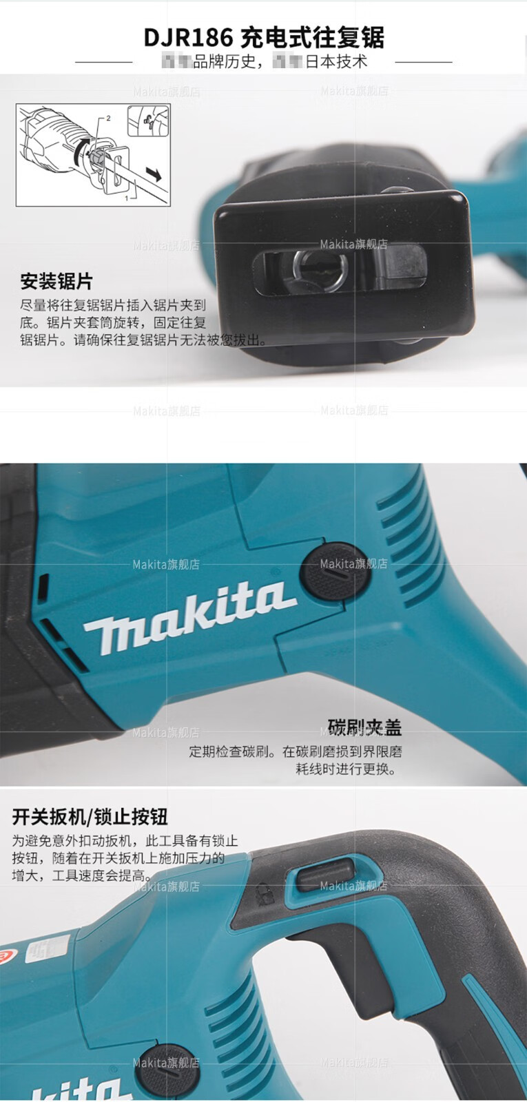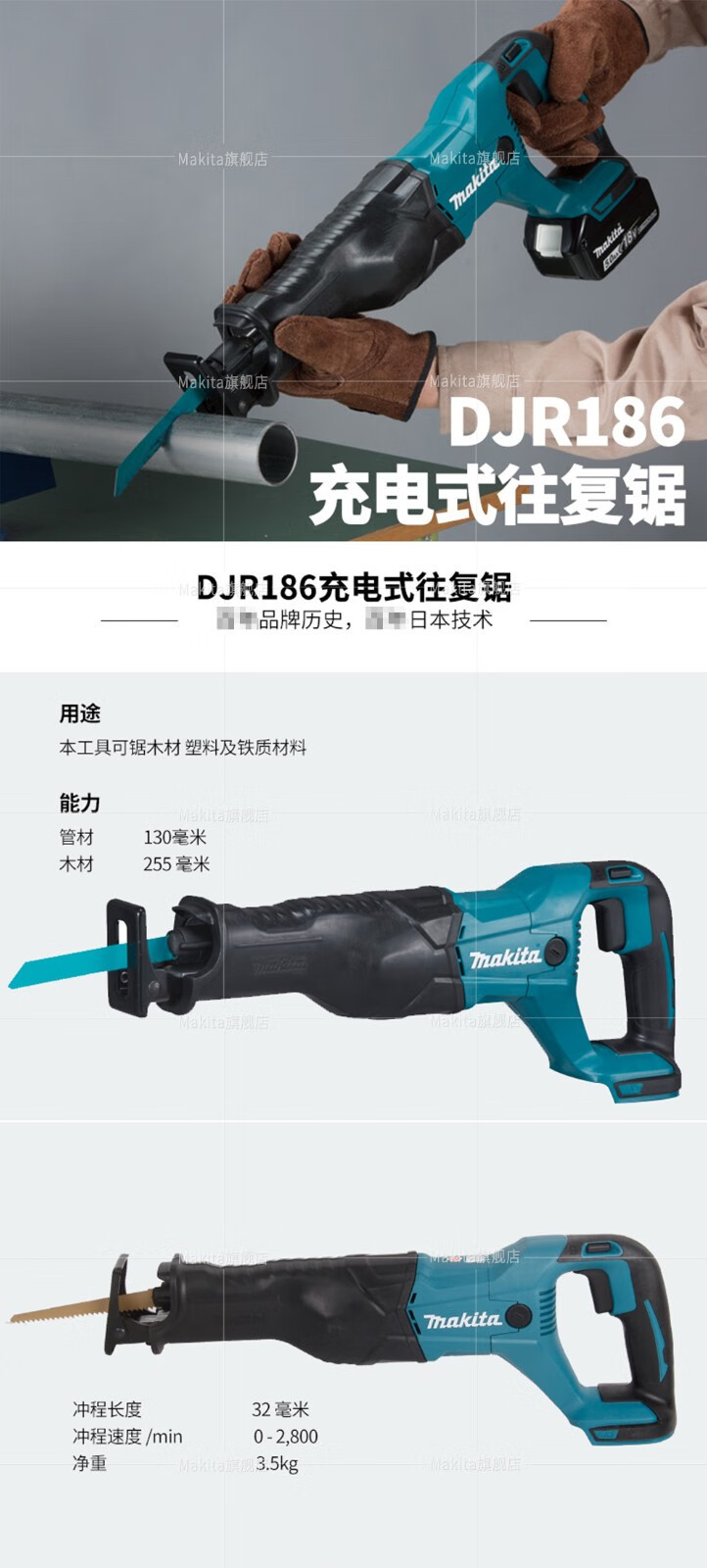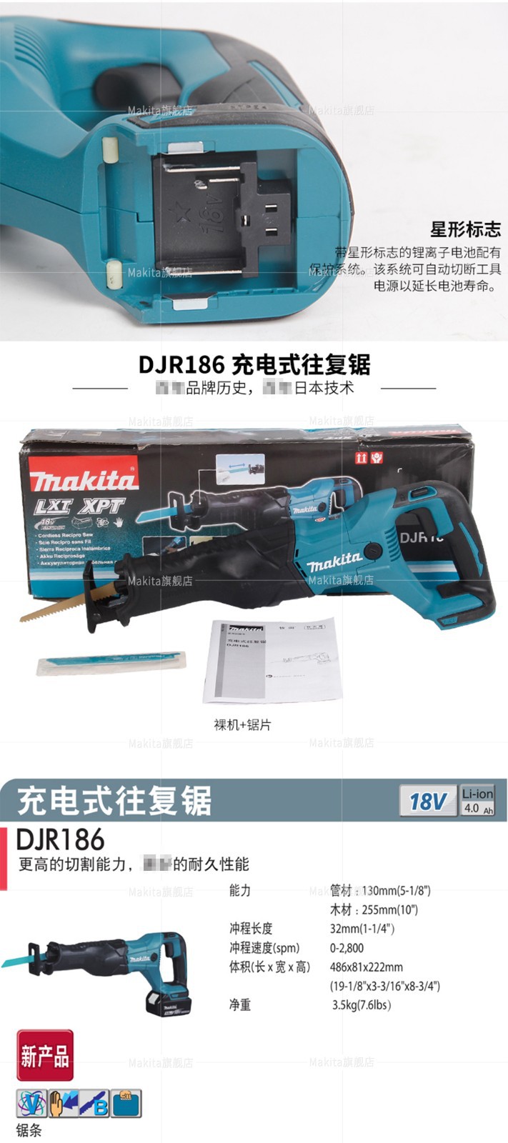 | Especificaciones | Sierra recíproca DJR186Z sin batería y cargador, sierra recíproca DJR186RME con dos baterías y una carga de 4.0ah, sierra recíproca DJR186RTE con dos baterías y una carga de 5.0ah, sierra recíproca DJR186RGE con dos baterías y una carga de 6.0ah |