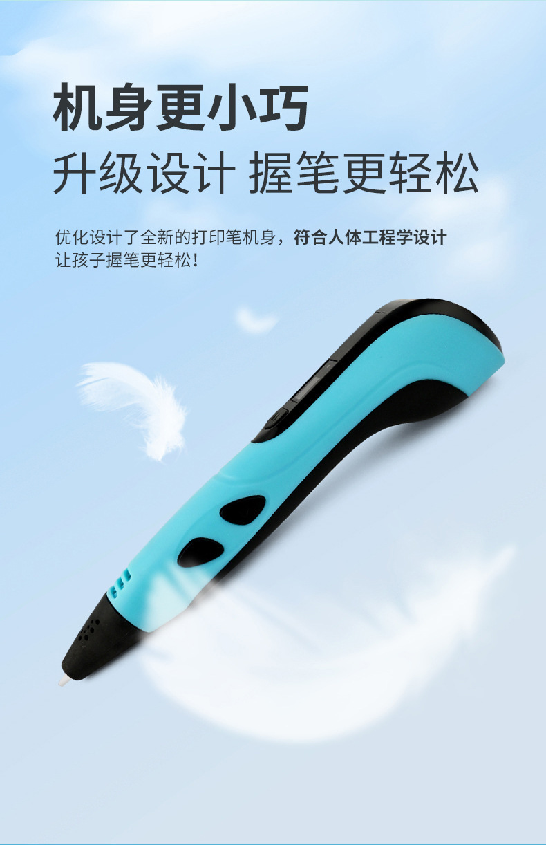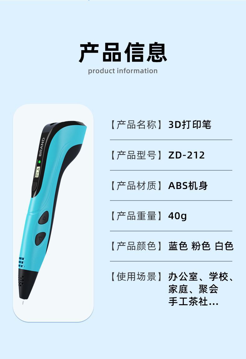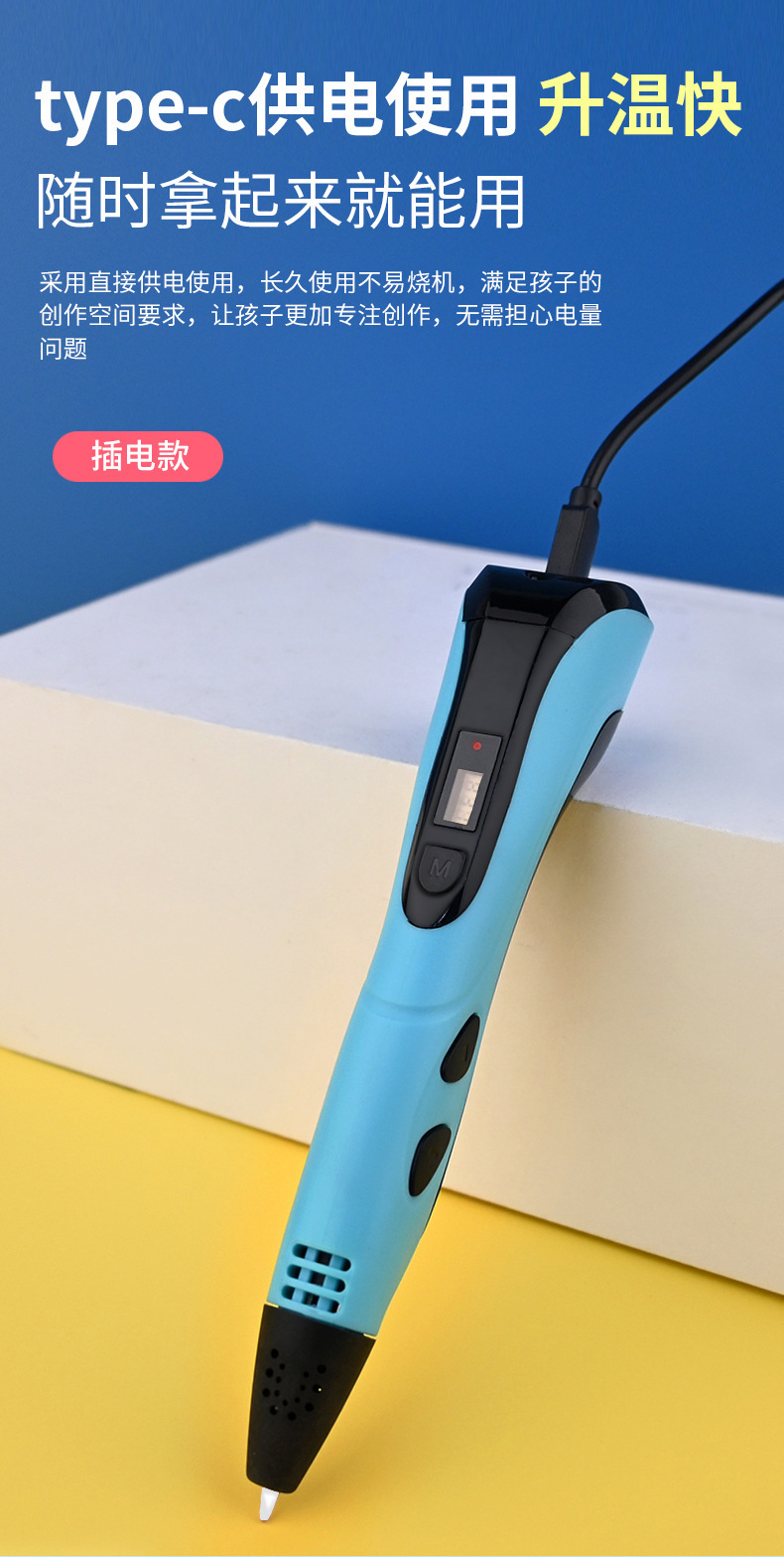 标配配置:3D打印笔+数据线+说明书+测试耗材(3米长/3个颜色)