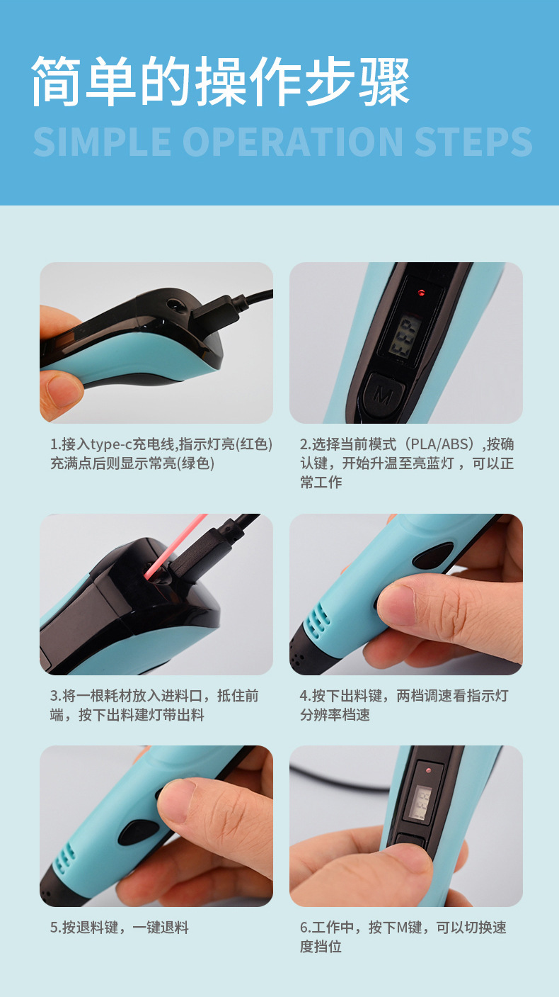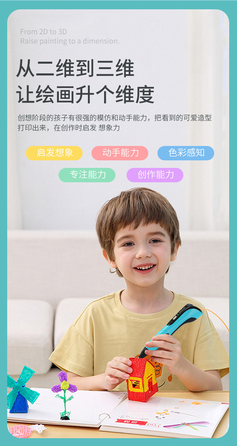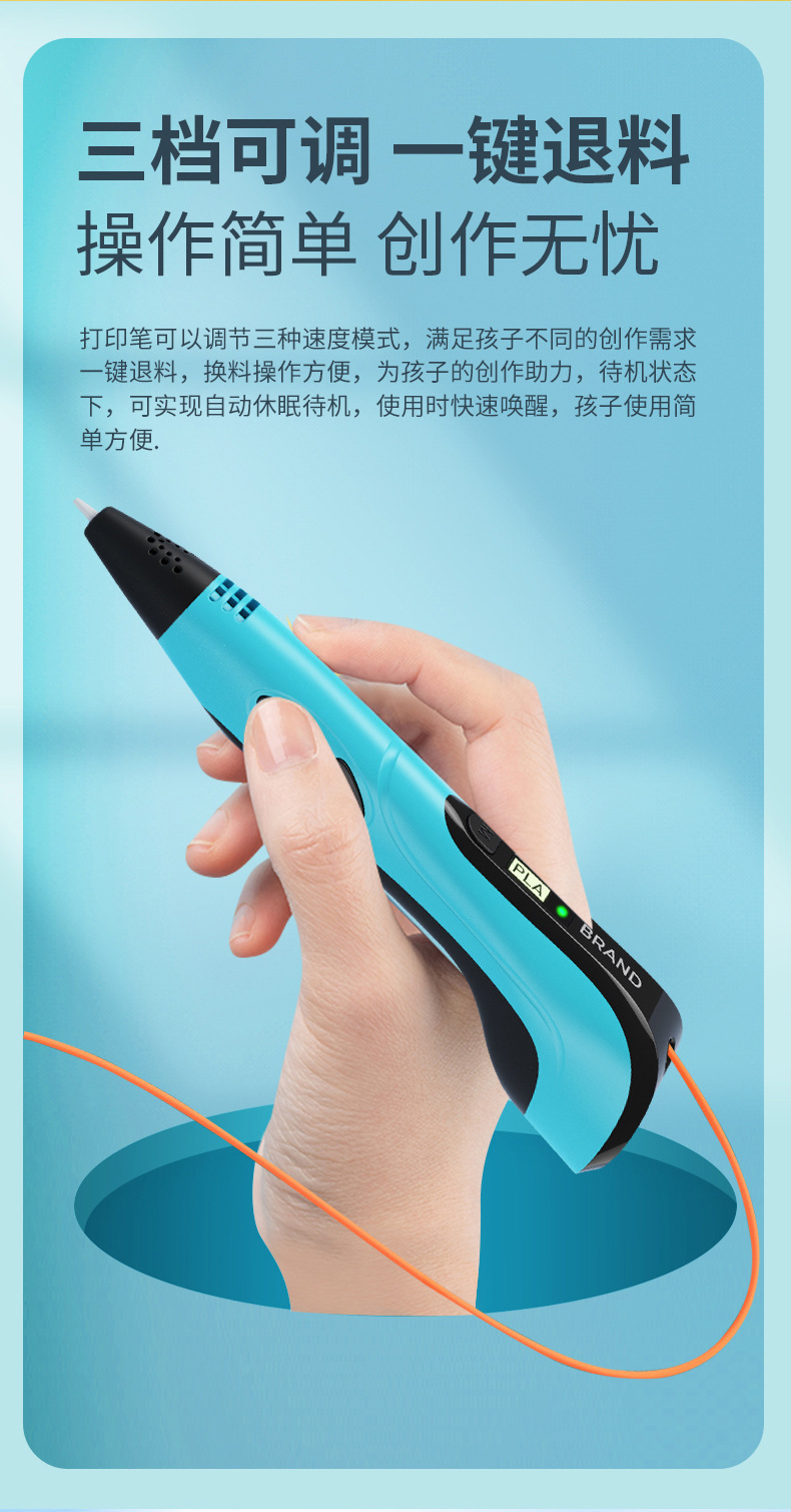标配配置:3D打印笔+数据线+说明书+测试耗材(3米长/3个颜色)