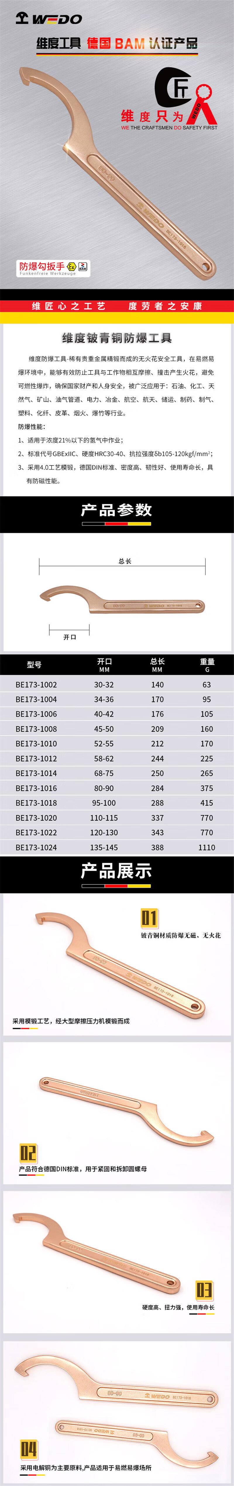 Dimensiones WEDO BE173 - 1016 Alemania DIN1810 llave de gancho estándar a prueba de explosiones 80 - 90mm