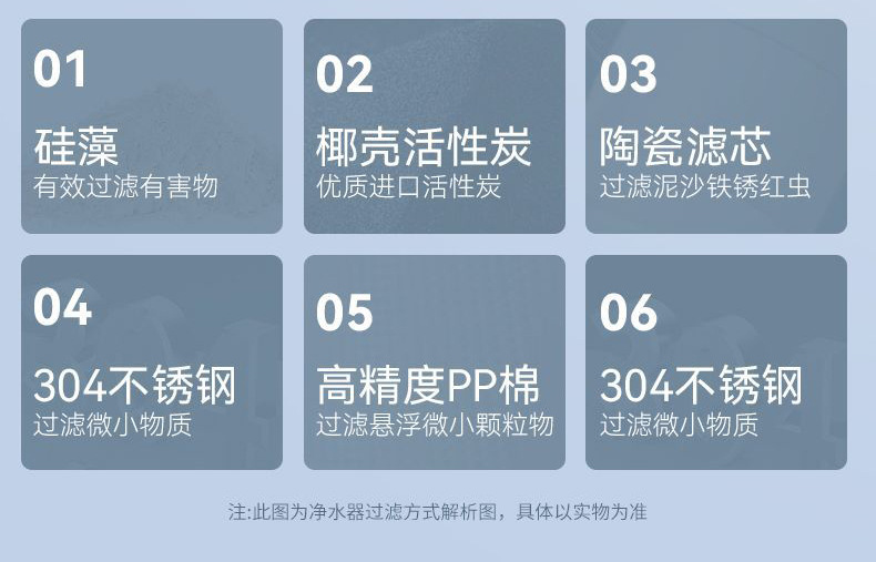 | Efecto de purificación de agua | Además de los metales pesados,Además del óxido,Eliminación de sedimentos,Eliminación de materia orgánica,Además de las bacterias,Excepto virus |