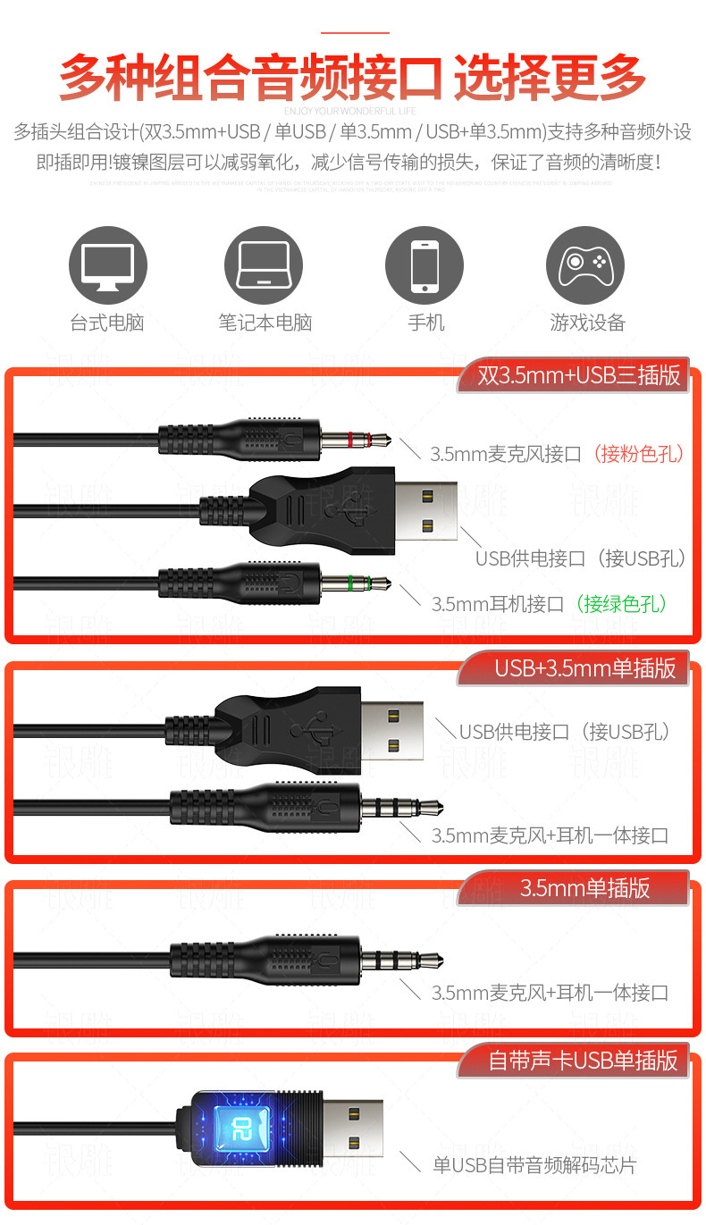 | Color | Luz colorida negra [doble 3,5mm + versión con alimentación USB],Luz colorida blanca [doble 3,5mm + versión con alimentación USB],Luz de colores Rosa [doble 3,5mm + versión alimentada por USB],Luz colorida negra [solo 3,5mm + versión con alimentación USB],Luz colorida negra [versión de la tarjeta de sonido usb7.1],Luz colorida blanca [Versión de tarjeta de sonido USB7.1],Luz colorida Rosa [versión de tarjeta de sonido USB7.1],Negro mate [versión de enchufe único de 3,5mm] |