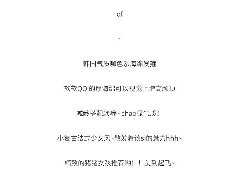 | Color | 2#黑色@,2#深咖色@,3#咖色@,4#奶茶色@,5#奶白色@,1#黑色@,2#焦糖色@,3#卡其色@,4#深咖色@,5#米白色@,1#蝴蝶结发箍-黑色@,2#蝴蝶结发箍-灰色@,1#白色@,3#黑色@,1#酒红色发箍@,2#红色发箍@,3#白色发箍@,4#黑色发箍@,2#香草磨卡@,3#乌龙奶咖@,6#毛绒浅棕@,9#交叉棕毛款@,15#交叉灰纹款@,18#酒红发箍@,1#喜庆红色发箍@,红色毛线发箍@,26#交叉棕色款@,28#红纹格子发箍@,4#黑色@,4#白色@,6#米色@,5#黑白格@,6#咖色大千鸟格@,1#海绵发箍@,1#浅卡其@,2#深咖@,5#黑色@,1#浅绿色发箍@,2#橘黄色发箍@,3#蓝色发箍@,4#粉色发箍@,6#白色发箍@,7#浅紫色发箍@,8#浅粉色发箍@,1#枚红色毛线款发箍-OPP袋装@,2#玫紫色斜纹款发箍-OPP袋装@,3#粉色亮片粗款发箍-OPP袋装@,4#西瓜红交叉纹发箍-OPP袋装@,5#深玫红交叉文毛线款发箍-OPP袋装@,6#玫红色棉布款发箍-OPP袋装@,1#芥末绿@,2#暗白@,3#暗粉@,6#黑色@,1#粉色薄纱发箍@,2#白色薄纱发箍@,3#粉色字母小香发箍@,4#粉色海绵发箍@,5#粉色细发箍@,6#浅粉色海绵发箍@,7#粉色宽边格子发箍@,1#米白@,2#粉色@,3#红色@,4#咖色@,1#粉色格子@,2#绿色格子@,3#蓝色格子@,4#绿色迷妮@,5#白色迷妮@,6#粉色迷妮@,2#金属花朵发箍@,3#珍珠标红色发箍@,5#金属爱心发箍@,6#金属椭圆标发箍@,1#褶皱爱心粉色发箍@,2#字母爱心粉色发箍@,1#米白色min发箍@,2#黑色min发箍@,3#米白色水钻发箍@,4#黑色水钻发箍@,2#黑色。@,3#小号山茶花@,4#大号山茶花@,5#白色网纱珍珠麻花发箍@,6#白色方钻发箍@,10#双层黑色珍珠发箍@,11#双层白色珍珠发箍@,14#米白格纹发箍@,1#白蝶黑箍@,2#白色山茶花@,3#黑色山茶花@,4#黑蝶白箍@,8#黑色@,2#黄棕色@,3#孔雀绿@,1#麻花辫黑色@,2#麻花辫浅咖色@,1#橘色细款@,2#白色细款@,3#紫色细款@,4#咖色细款@,5#浅蓝细款@,7#粉色细款@,8#黄色细款@,10#绿色心情@,1#黑色高级感@,7#黑色@,2#白色@,9#黑色@,2#卡其@,3#米白@,10#黑色@,2#米白@,3#绿色@,4#蓝色@,5#卡其@,6#浅紫@,7#湖蓝@,8#黄色@,9#粉色@,10#橘色@,16#红色B款@,18#奶白色B款@,3#白色@,11#黑色@,3#蓝色@,4#粉色@,8#紫色@,9#褐色@,10#西瓜粉@,11#米色@,12#银灰色@,13#玫红色@,1#黄咖@,66#黑色@,5#粉色@,5#米白@,3#粉色花朵发箍@,4#黑色花朵发箍@,5#米咖花朵发箍@,16#咖色花朵发箍@,13#黑色@,2#奶茶色@,3#深咖@,4#米白色毛线发箍@,1#皱褶黑色大款@,2#褶皱白色(大)@,3#褶皱黑色(中)@,4#褶皱黑色(小)@,10#褶皱爱心发箍@,11#褶皱mln发箍@ |