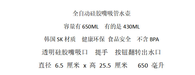 | Colores | Botella de agua de silicona automática roja Spiderman (650ML),Botella de agua con boquilla automática de silicona compatible con máscara facial (650 ml),Botella de agua de silicona automática para juegos azul translúcido SK (650ML,Botella de agua de silicona automática verde Stitch (650ML),Botella de agua con boca de silicona automática morada Gabi (430ML),Botella de agua de boca de silicona automática KT gato blanco (650ML),Pijama azul pequeño héroe botella de agua de boca de silicona automática (430ML),Botella de agua de silicona automática de Sonic azul (650ML),Botella de agua de silicona automática de unicornio degradado (430ML),Botella de agua de silicona automática púrpura nutria (650ML),Collar rosa gato automático de silicona boca hervidor (650ML),Botella de agua de boca de silicona automática negra Sun Moon Tonghui (650ML),Botella de agua con boca de silicona automática de unicornio brillante plateado púrpura (650ML),Botella de agua de boca de silicona automática automática verde MinecMundial (650ML),Hervidor de boca de silicona totalmente automático Marvel (650ML),Hervidor de boca de silicona totalmente automático Ariel (650ML),Botella de agua de silicona totalmente automática Harry Potter negra (650ML),Hervidor de agua totalmente automático con boca de silicona, diseño de dinosaurio con línea gris (650 ml),Hervidor de agua bucal de silicona totalmente automático Black Warrior (650 ml),Hervidor de agua con boca de silicona totalmente automático Pink Rabbit (650 ml),Hervidor de agua con boca de silicona totalmente automático Black Flamingo (650 ml),Botella de agua de silicona totalmente automática con diseño de cocotero púrpura.,Hervidor de agua deportivo negro No. 8 con boca de silicona totalmente automática (650 ml),Hervidor de boca de silicona totalmente automático gris naranja (650ML),Hervidor de agua totalmente automático Paw Patrol (650ML),Hervidor totalmente automático Black Moon Mermaid (650ML),Hervidor automático de silicona con forma de coche deportivo (430 ml),Hervidor automático de silicona con forma de rana morada (430 ml),Hervidor automático de silicona con forma de cola de pez rosa y boca de conejo (430 ml),Hervidor de agua totalmente automático con boca de silicona Pink Peppa Pig (430ML),Hervidor de agua totalmente automático con boca de silicona Blue Shark (430ML),Hervidor de agua totalmente automático con boca de silicona Green Rabbit (430ML),Hervidor de agua totalmente automático con boca de silicona Purple Music Pony (430 ml) |