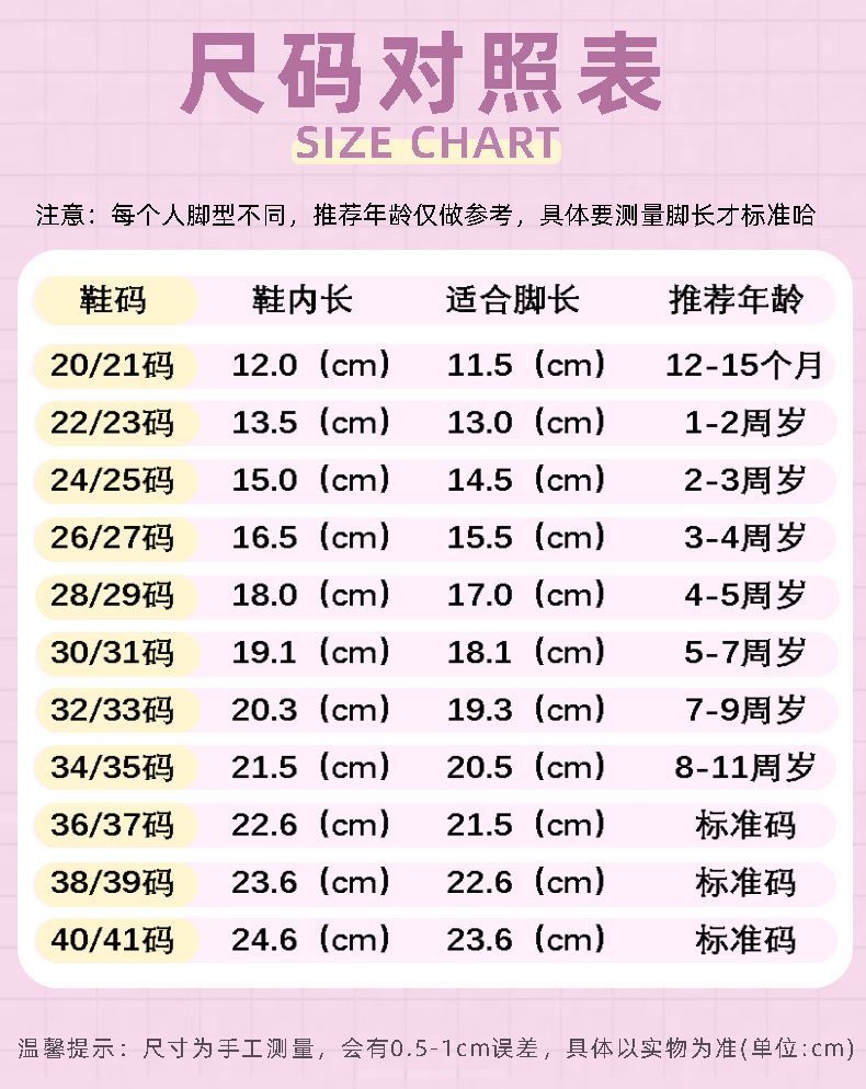 | Talla | 1-2 meses de 20 / 21 yardas de longitud interna 1-2.0 cm, 22 / 2-3 yardas de longitud interna 13.5 cm 1 - 2 años, 24 / 25 yardas de longitud interna 15.0 cm 2 - 3 años, 26 / 27 yardas de longitud interna 16.5 cm 3 - 4 años, 28 / 29 yardas de longitud interna 18.0 cm 4 - 5 años, 30 / 31 yardas de longitud interna 19.1 cm 5 - 7 años, 32 / 33 yardas de longitud interna 20.5 cm 7 - 9 años |