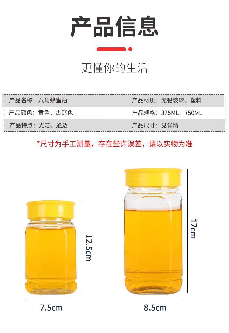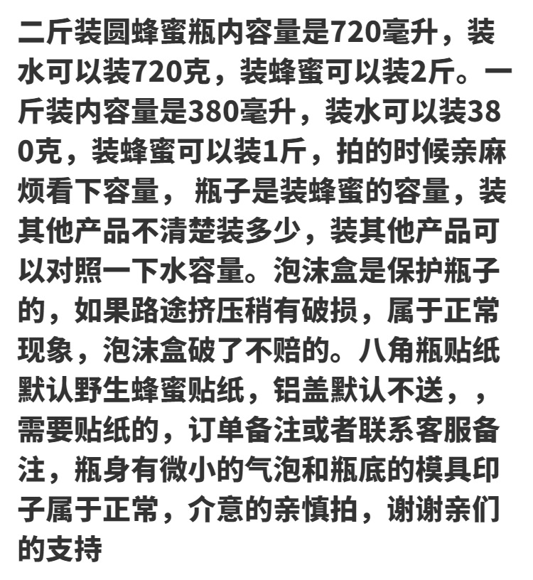 | Color | botella de miel redonda tapa de aluminio, 2 kg 1 paquete (paquete de prueba), octogonal 2 kg 1 paquete + película de calcomanía de pegatinas, 750 ml botella enlatada 1 paquete, 1 kg botella redonda 2 paquetes + tapa no acoplada, 1 kg botella redonda 3 paquetes + tapa no acoplada, octogonal 2 kg 2 paquetes + película de calcomanía de pegatinas, octogonal 1 kg 3 paquetes + película de calcomanía de pegatinas, octogonal 2 paquetes + tapa no acoplada, 750 ml botella enlatada 2 paquetes, octogonal 1 kg 4 paquetes + película de calcomanía de pegatinas, Botella redonda de un jin 4 paquetes + tapa no acoplada, botella redonda de dos jin 3 paquetes + tapa no acoplada, botella redonda de dos jin 4 paquetes + tapa no acoplada, botella redonda de ocho jin 6 paquetes + película de pegatinas |