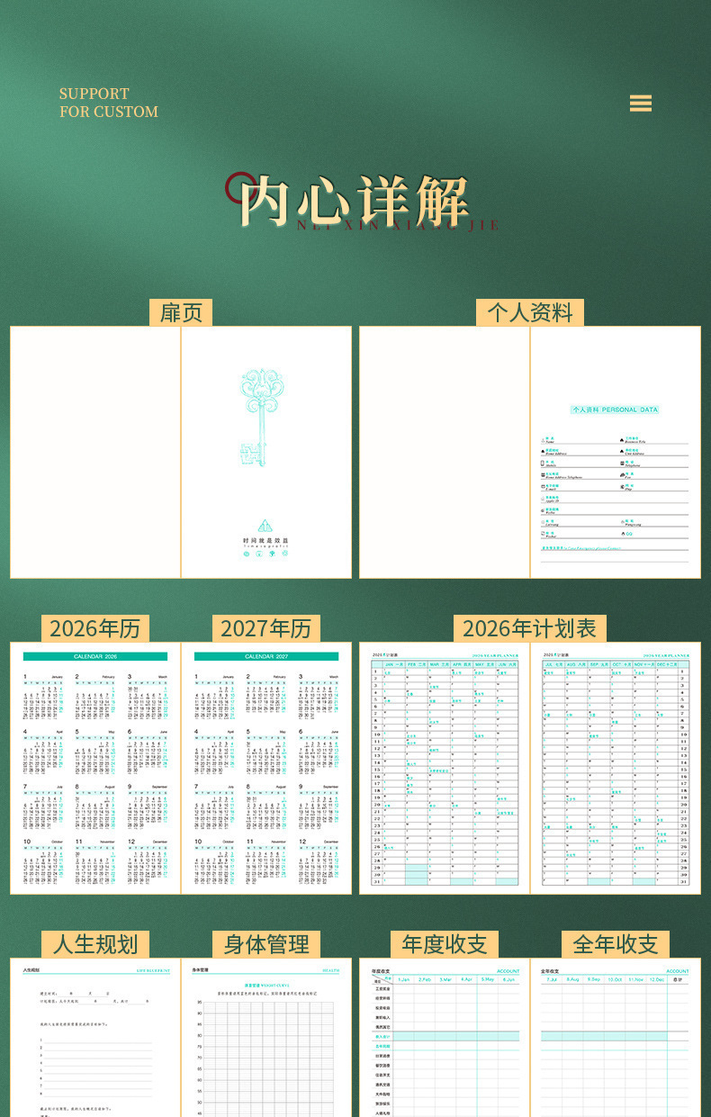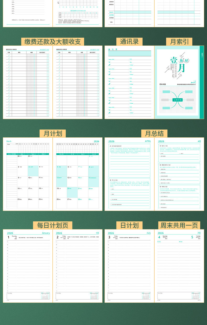 | Color de la portada | El azul azul (2026.1-2026.12), café marrón (2026.1-2026.12), Matcha verde (2026.1 - 2026.12), verde oscuro (2026.1-2026.12), Negro de Negocios (2026.1-2026.12), rojo de Año Nuevo (2026.1-2026.12), azul precioso [caja de regalo](2026.1-2026.12), café marrón [caja de regalo](2026.1-2026.12), Matcha verde [Caja de regalo](2026.1-2026.12), verde oscuro [Caja de regalo](2026.1-2026.12), Negro de negocios [caja de regalo] (2026.1-2026.12), Rojo de Año Nuevo [caja de regalo] (2026.1-2026.12), Negro [PU cardíaco], Azul pálido [PU cardíaco], Rojo [PU cardíaco], Gris [PU cardíaco], Azul [PU cardíaco], Verde [PU cardíaco], Azul oscuro [PU cardíaco], Brown [PU cardíaco] |