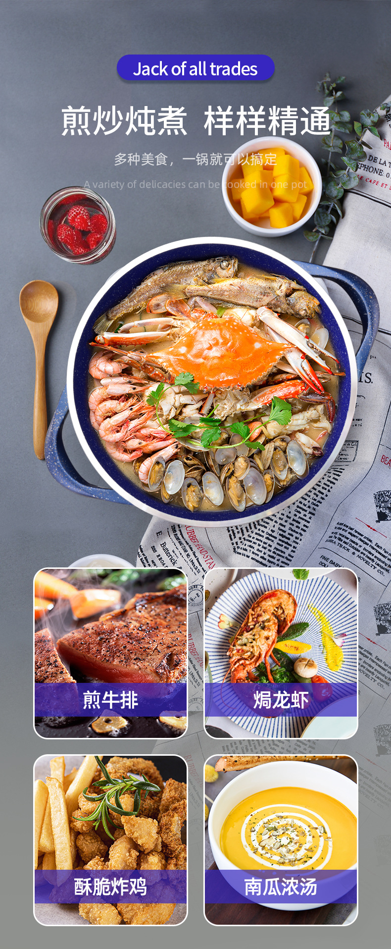 2.不粘厨具传热均匀,使用时只须用中至小火,便可烹调出美味食物。采用大火时,应注意避免烧到把手,且不可干烧,锅内必须有食物或水。