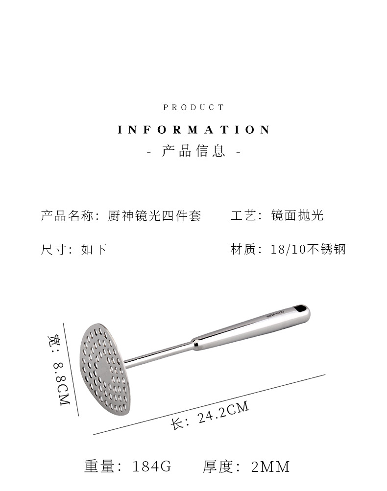Cocina de la serie 18 / 10 espejo de acero inoxidable prensador de barro de luz de fugas de cocina de cocina de pala de verduras de cocina de cocina