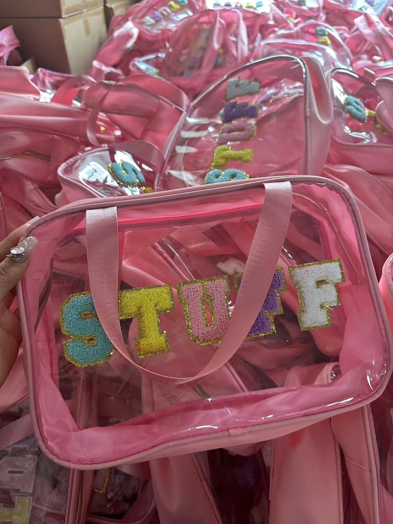 Bolsa de cosméticos de nuevo estilo transfronteriza, bolsa transparente de gran capacidad, bordado de letras en toalla, bolsa de almacenamiento multifuncional portátil para salir