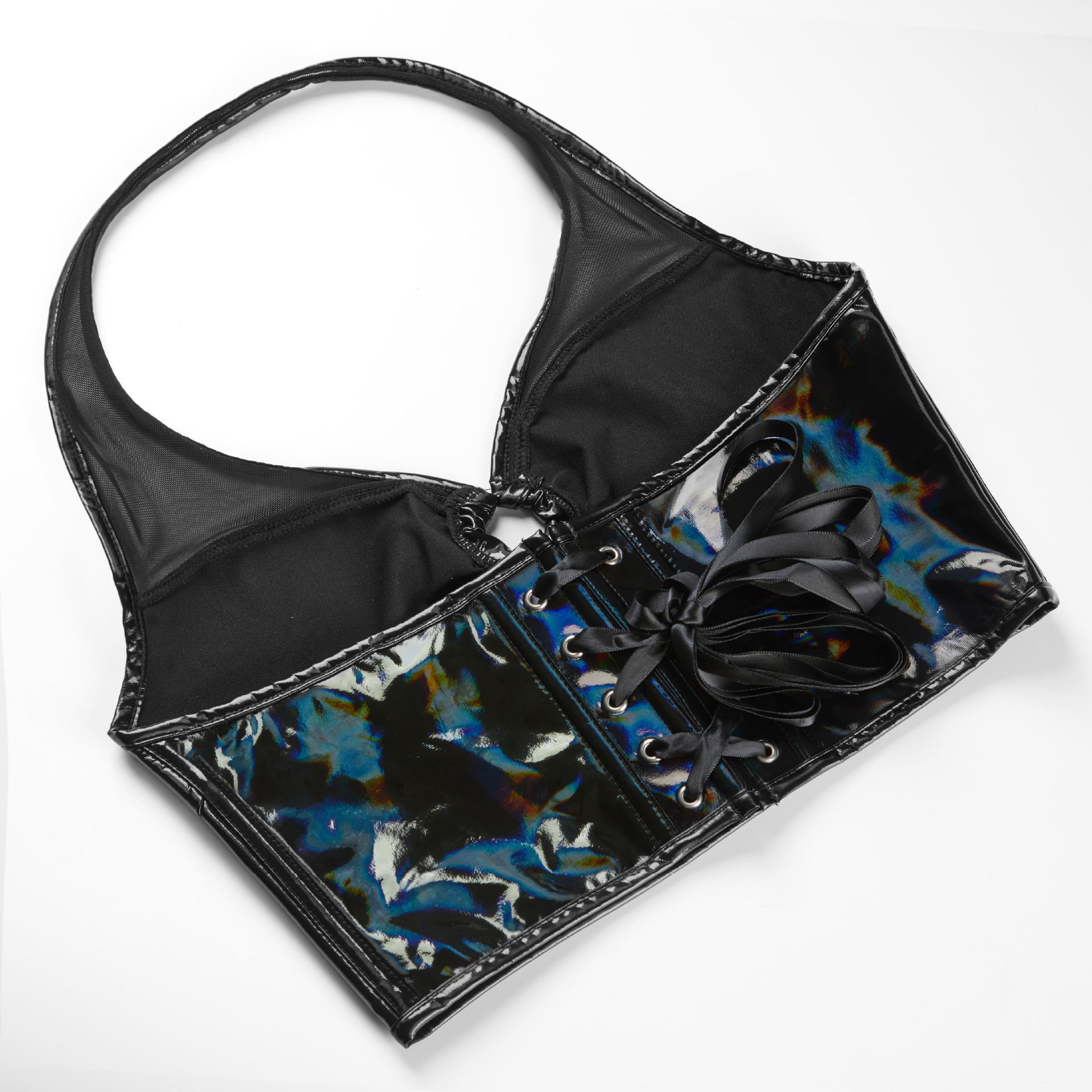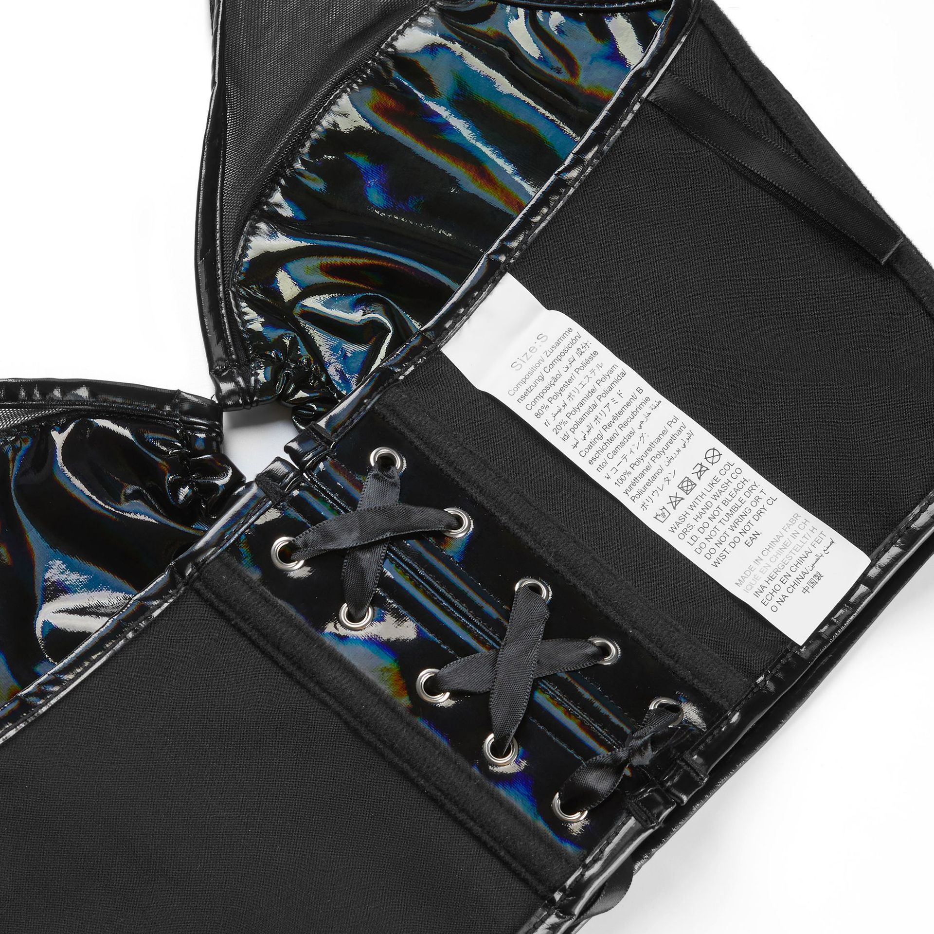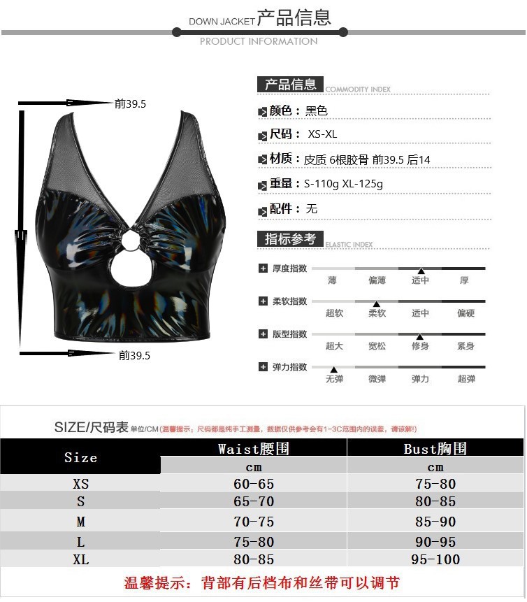 Europa y los Estados Unidos correa nueva malla de cuero PU empalmado hueco sexy envuelto pecho cuello plástico ropa de mujer suministro transfronterizo