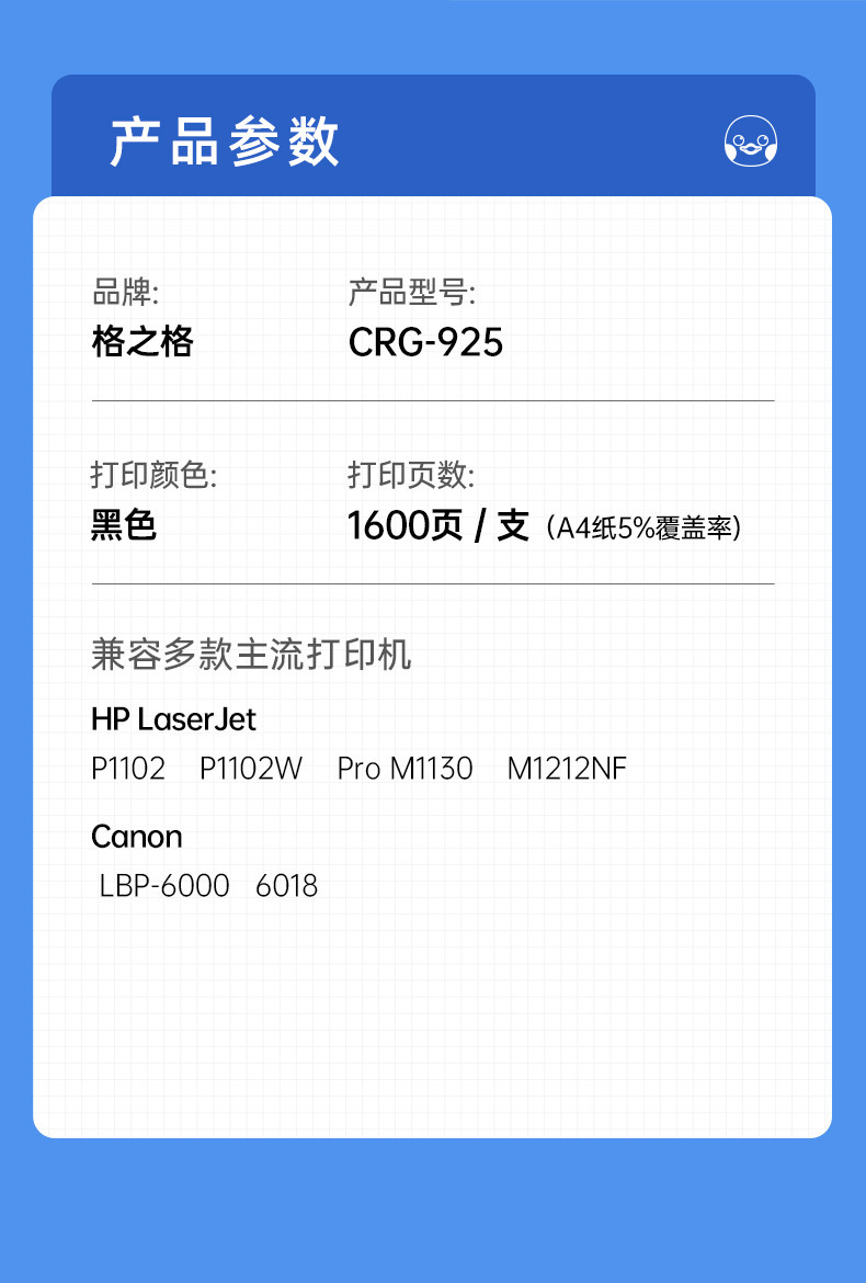 | Modelo de marca aplicable | Canon CRG - 925 cartucho de tóner LBP6018 LBP6000 3018 cartucho de tóner HP ce285a P1102 |
