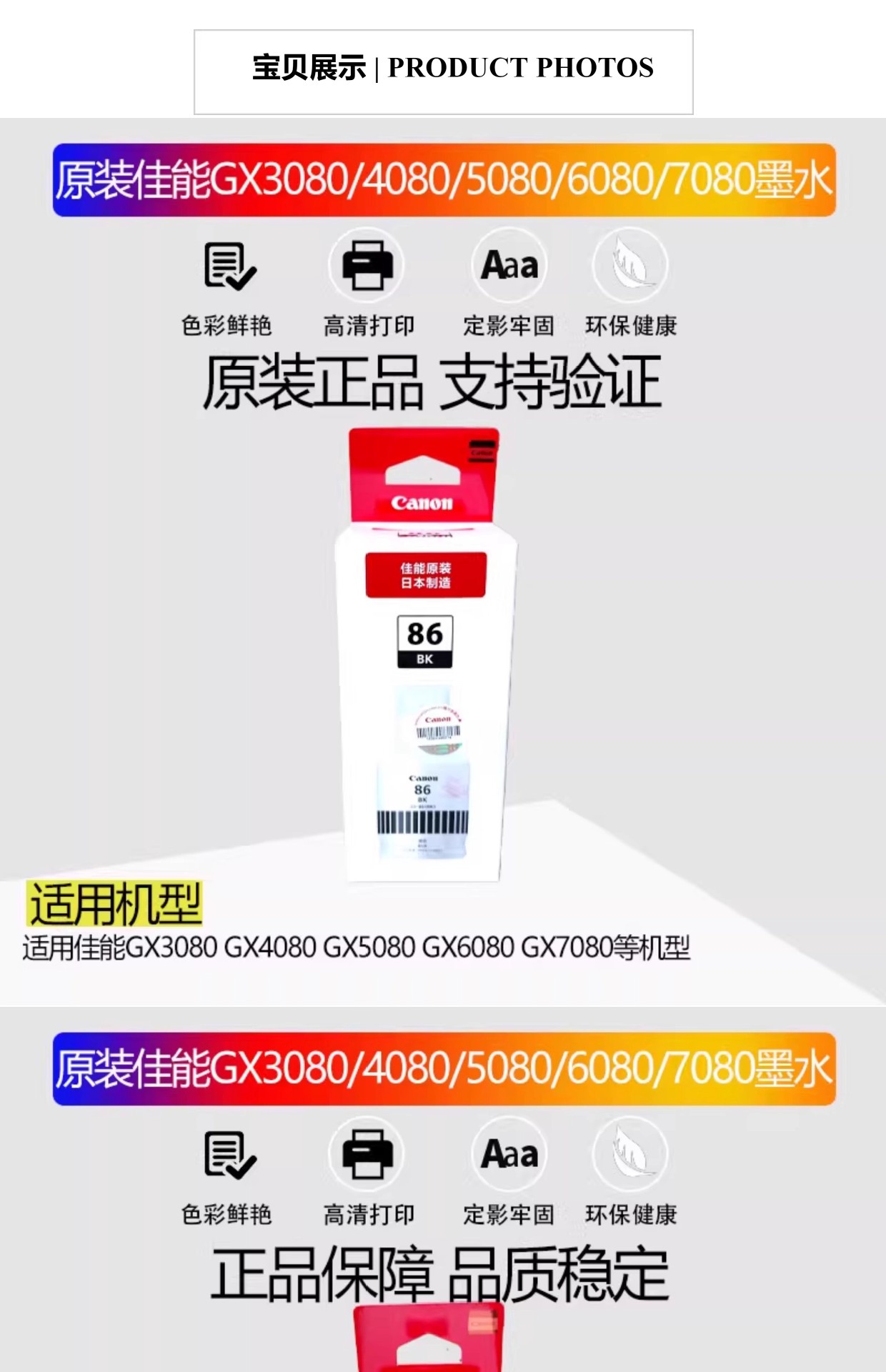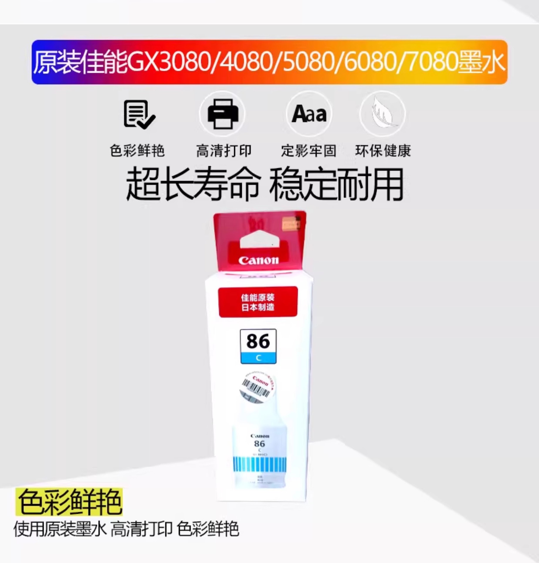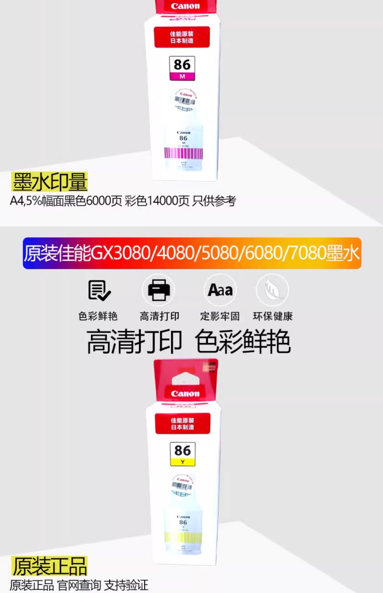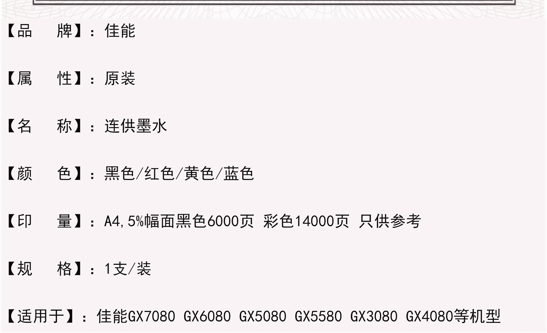 | Color | GL - 86BK tinta negra 170ML aproximadamente 6000 páginas, GL - 86M tinta roja 135ML aproximadamente 14000 páginas, GL - 86Y tinta amarilla 135ML aproximadamente 14000 páginas, GL - 86C tinta azul 135ML aproximadamente 14000 páginas, paquete GL - 86 de cuatro colores, Coste para GX4080 negro, Coste para GX4080 rojo, Coste para GX4080 amarillo, Coste para GX4080 azul, Coste para GX4080 cuatro colores |