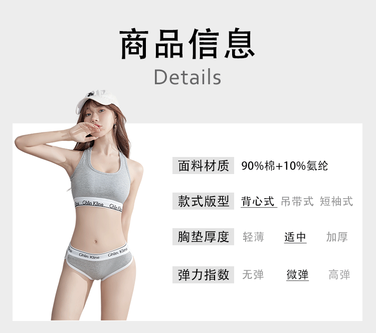 | Colores | Conjunto blanco,Traje gris,Traje negro,Ropa interior blanca,Ropa interior gris,Ropa interior negra,Bragas blancas,Bragas grises,Bragas negras |