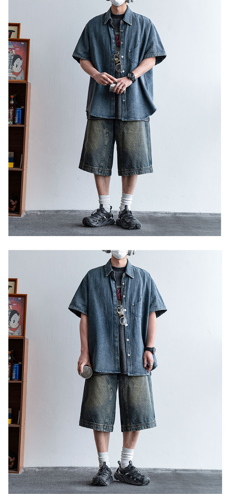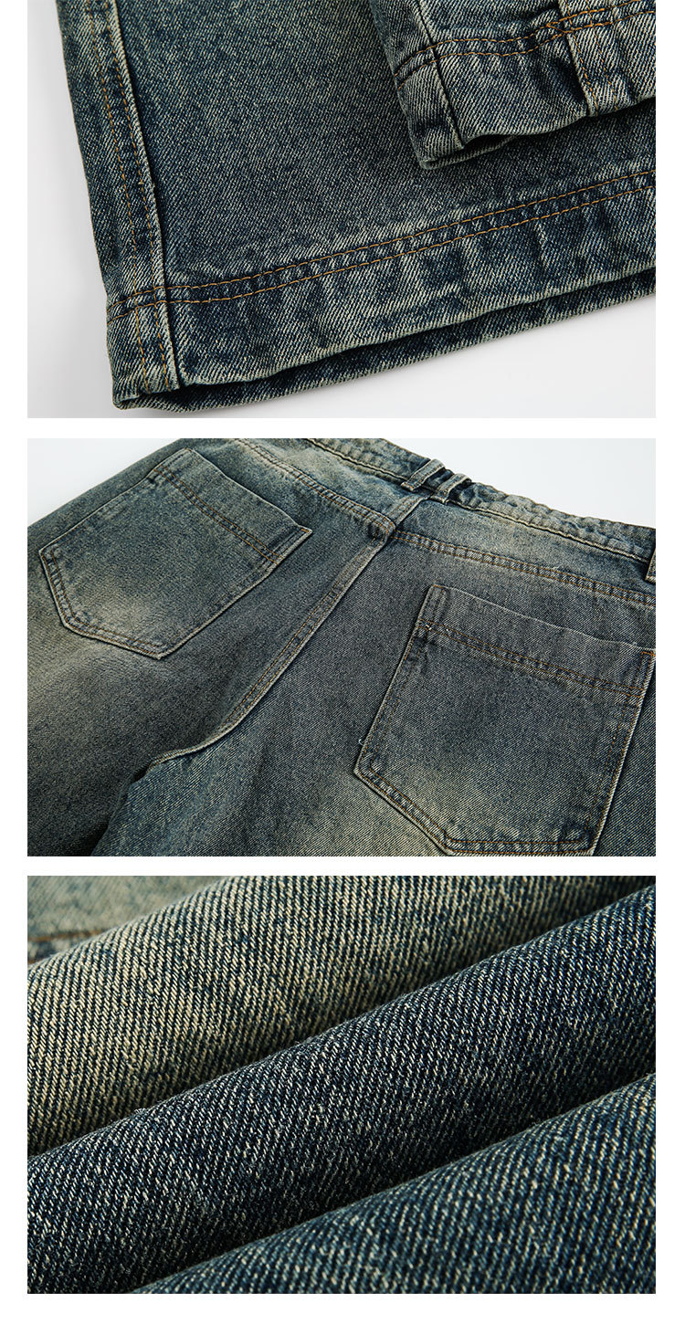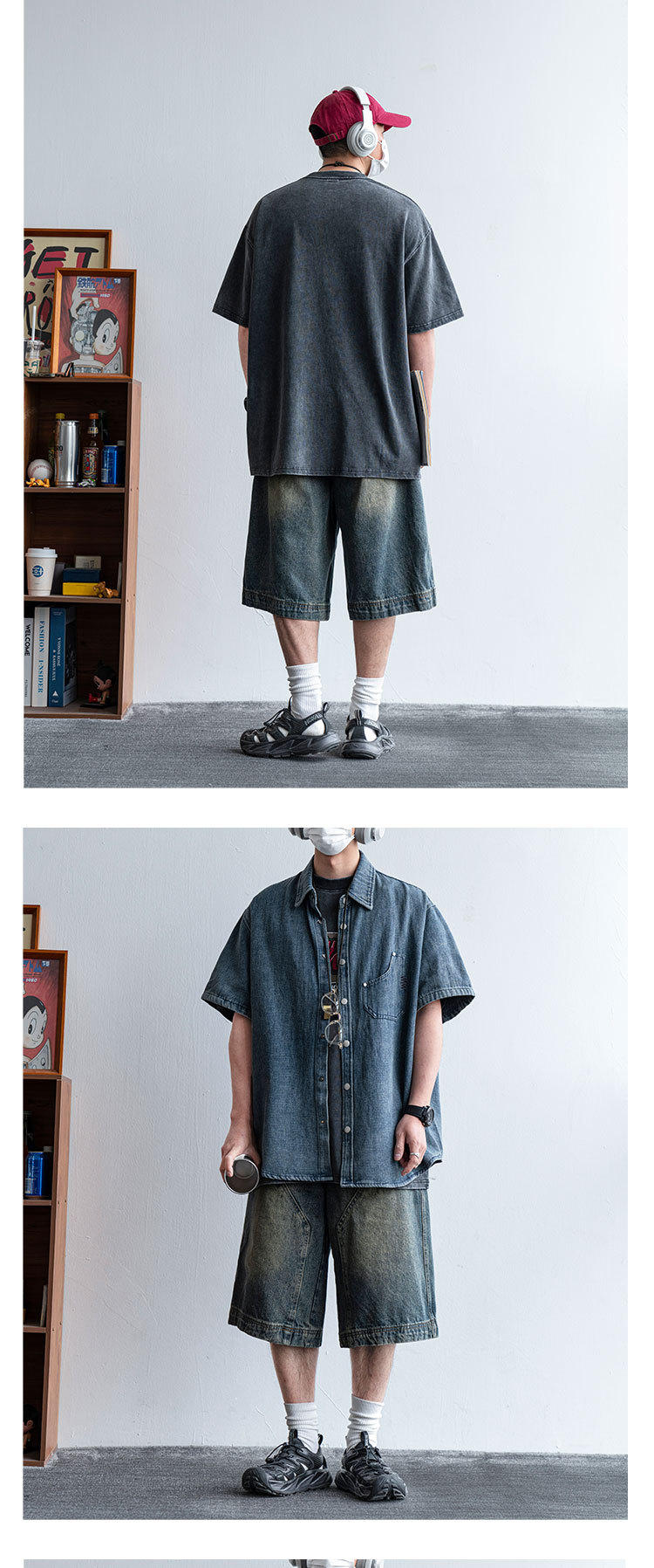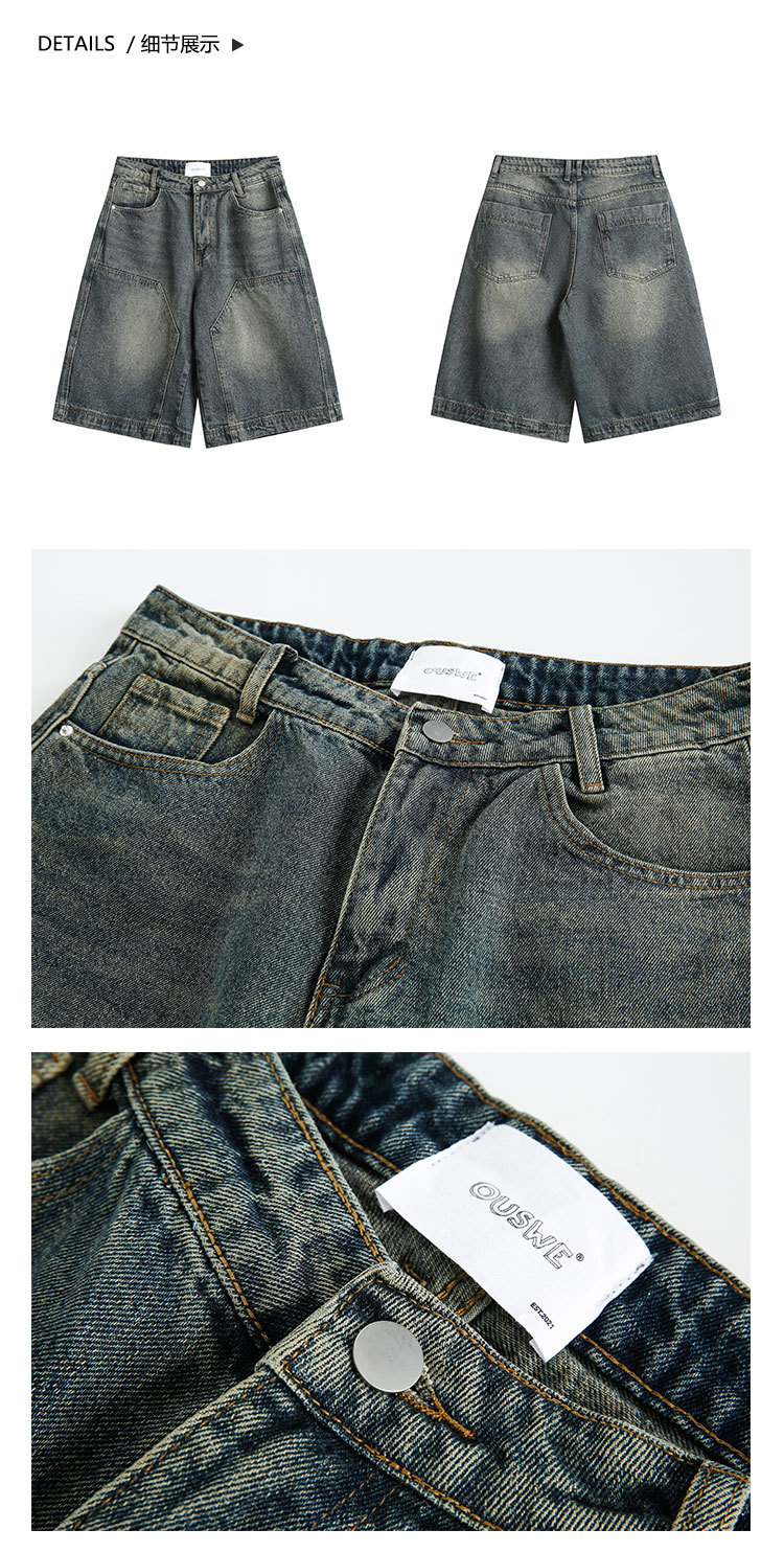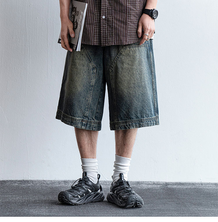 Camisas poco ropa pesada lavado con agua jeans cortos de moda masculinos retro lavado con agua nicho diseño de pantalones de piernas anchas