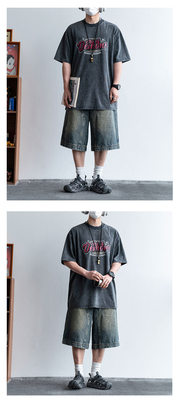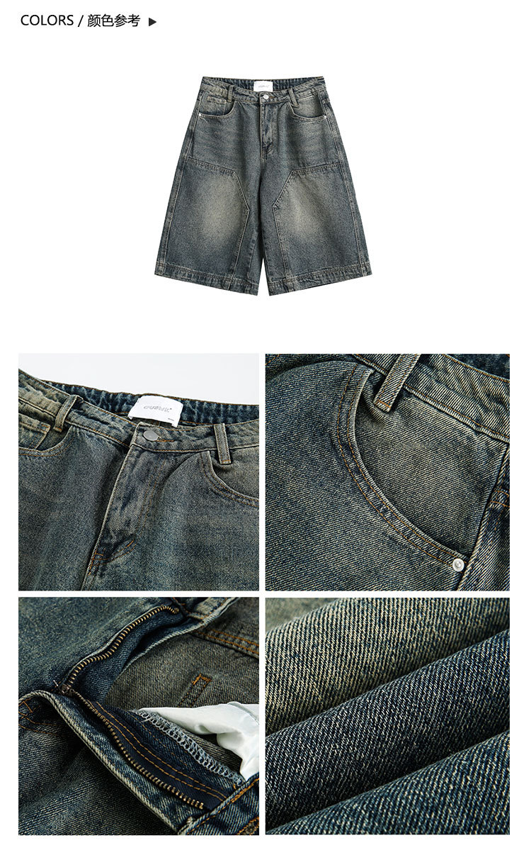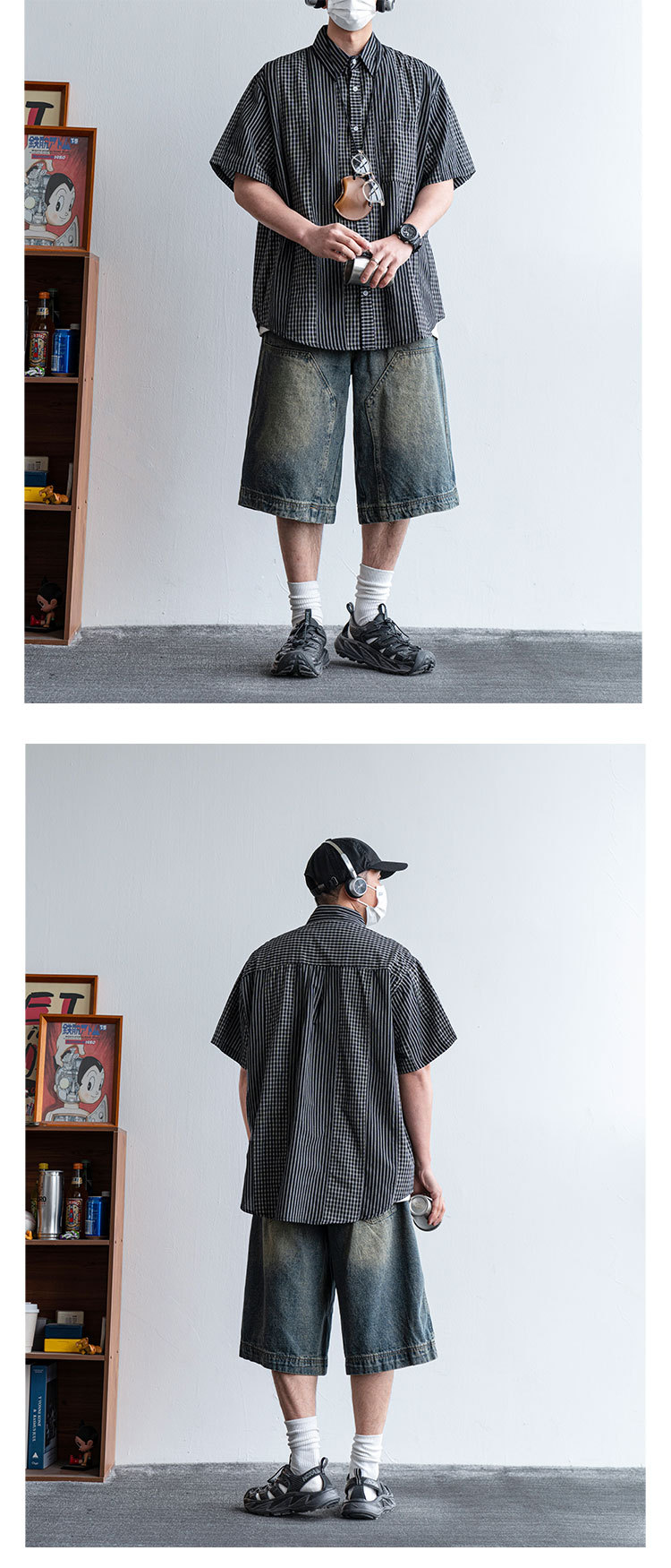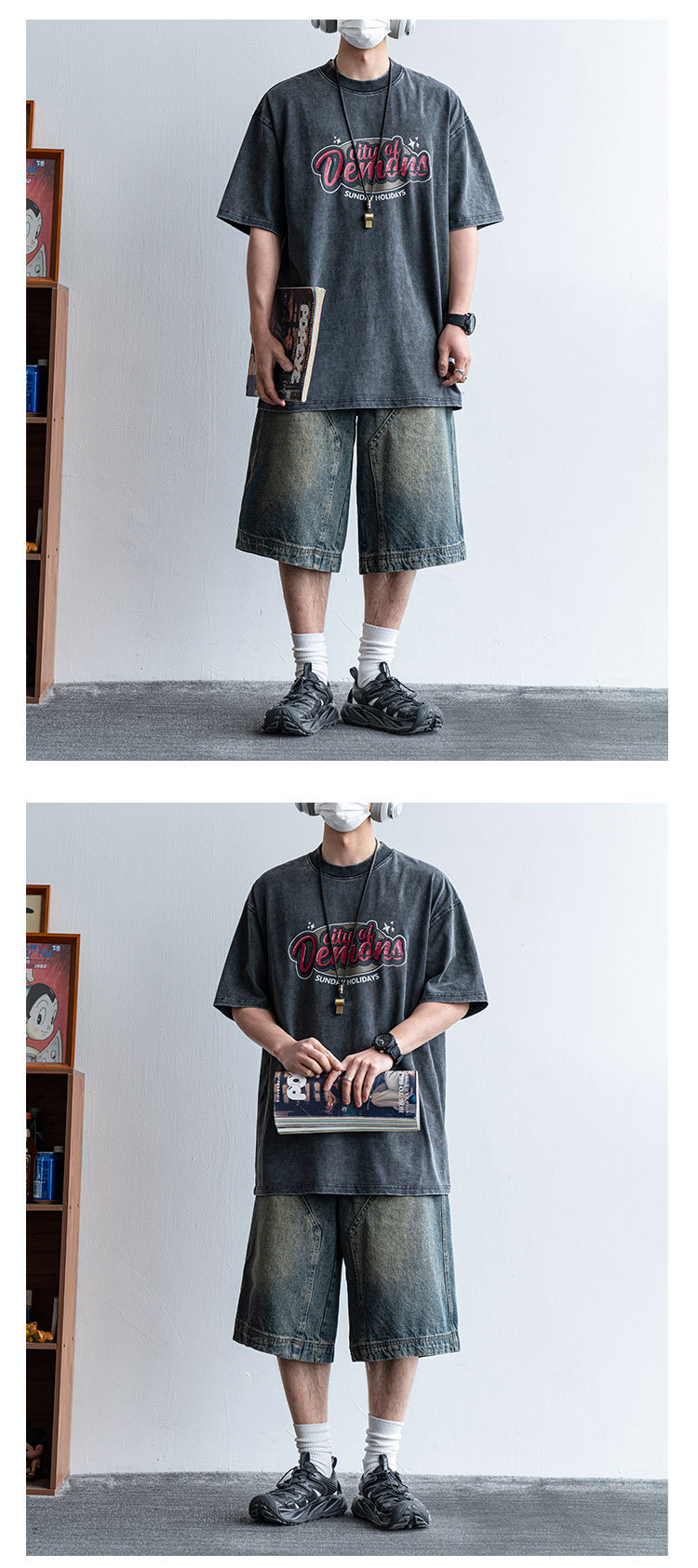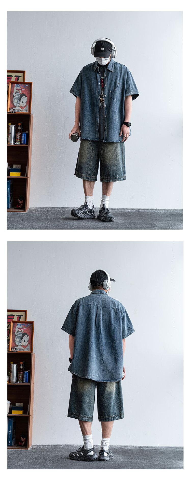 Camisas poco ropa pesada lavado con agua jeans cortos de moda masculinos retro lavado con agua nicho diseño de pantalones de piernas anchas