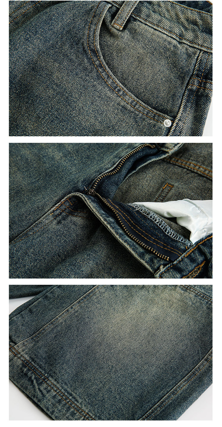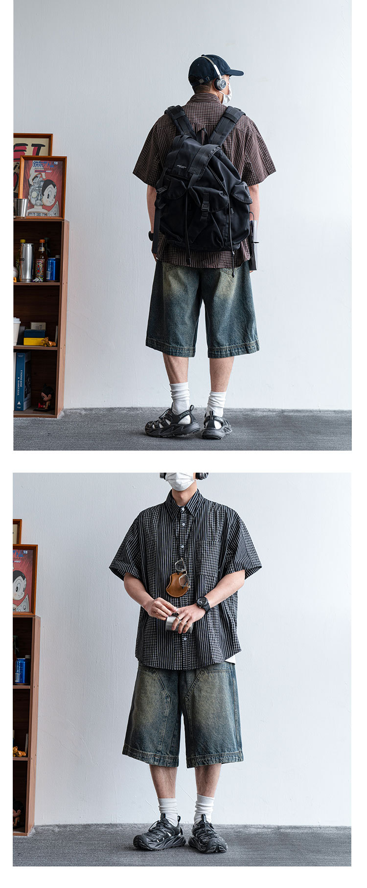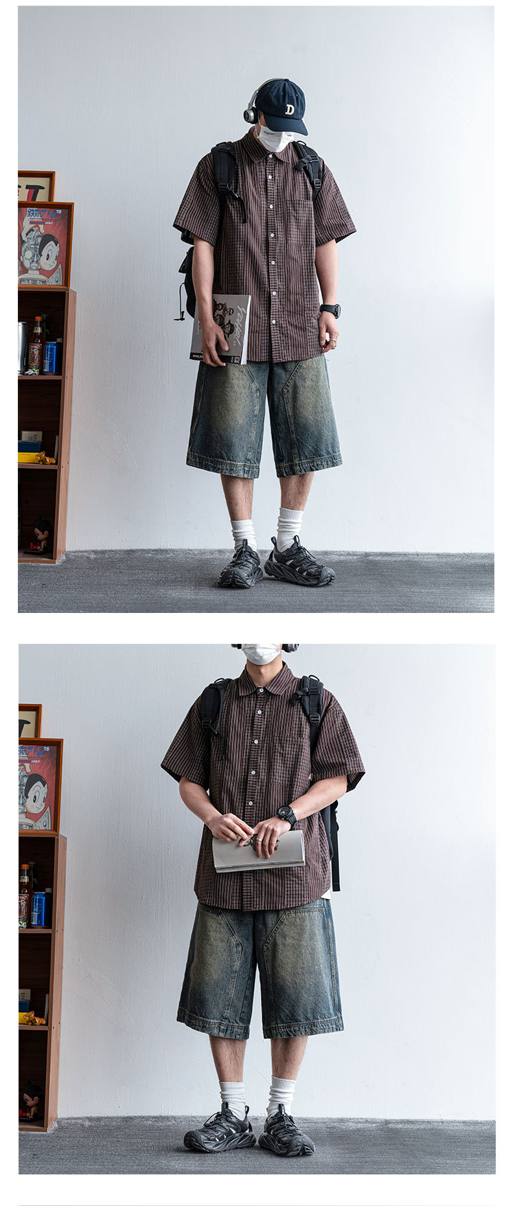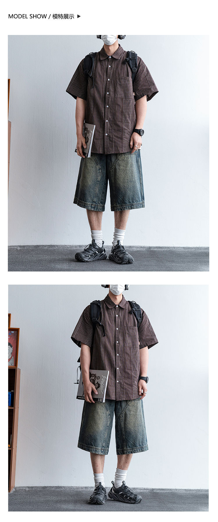Camisas poco ropa pesada lavado con agua jeans cortos de moda masculinos retro lavado con agua nicho diseño de pantalones de piernas anchas