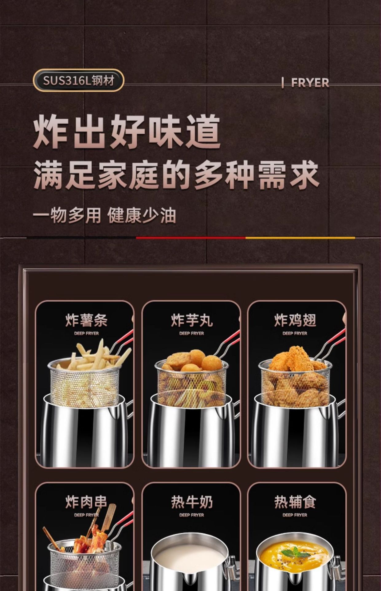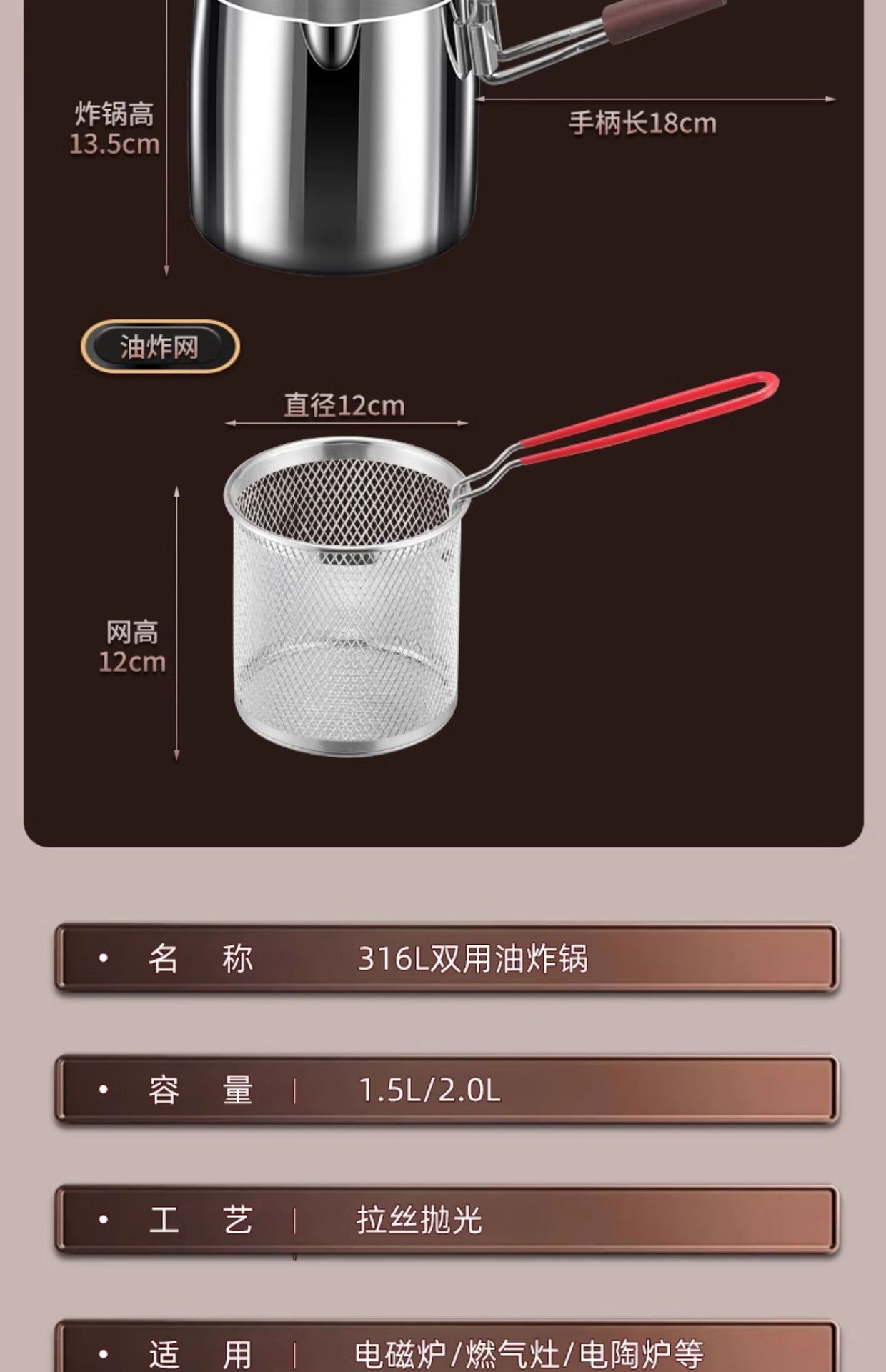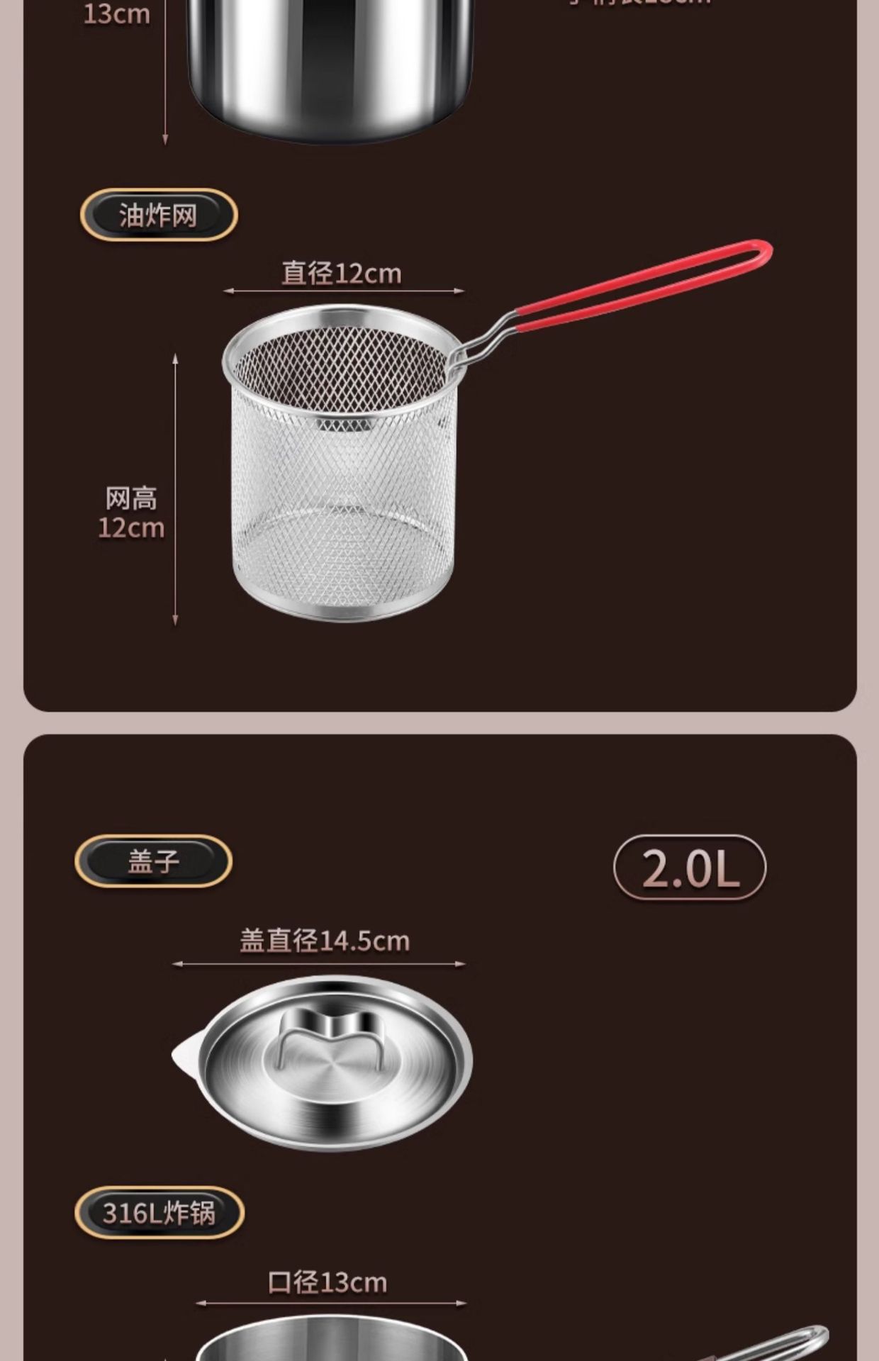 | Capacidad | Espejo de 1.5L [Freidora de acero 316],Espejo 2L [Freidora de acero 316],2.4L tipo de profundización [316 freidora de acero],Estilo de mango corto de 1.5L [Freidora de acero 316],2.0L mango corto [316 freidora de acero],Estilo de mango corto de 1.5 litros (canasta para freír de un solo mango) [316 freidora],2.0 litros mango corto (cesta frita de un solo mango) [316 freidora] |