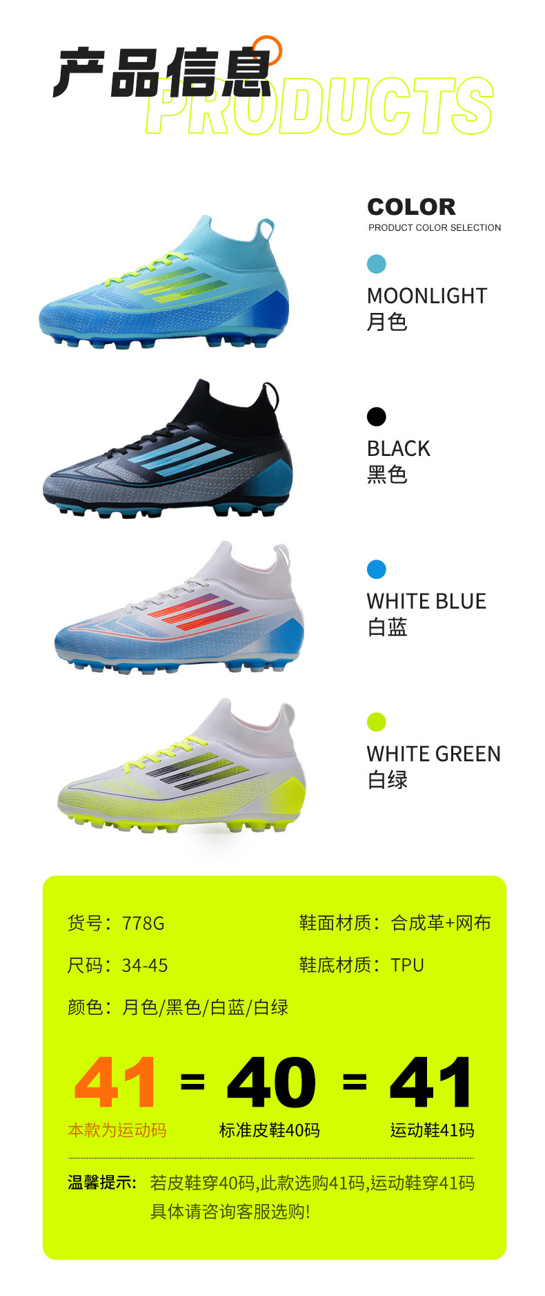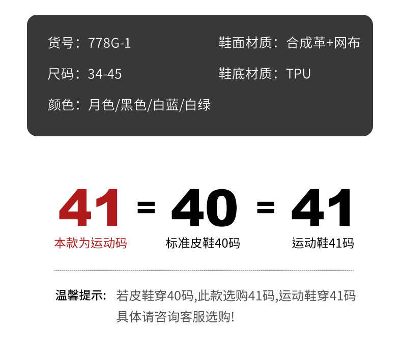 2. 尺码问题:一般都是运动鞋正常尺码,比如你平常穿41码,购买41码。标准运动鞋尺码。