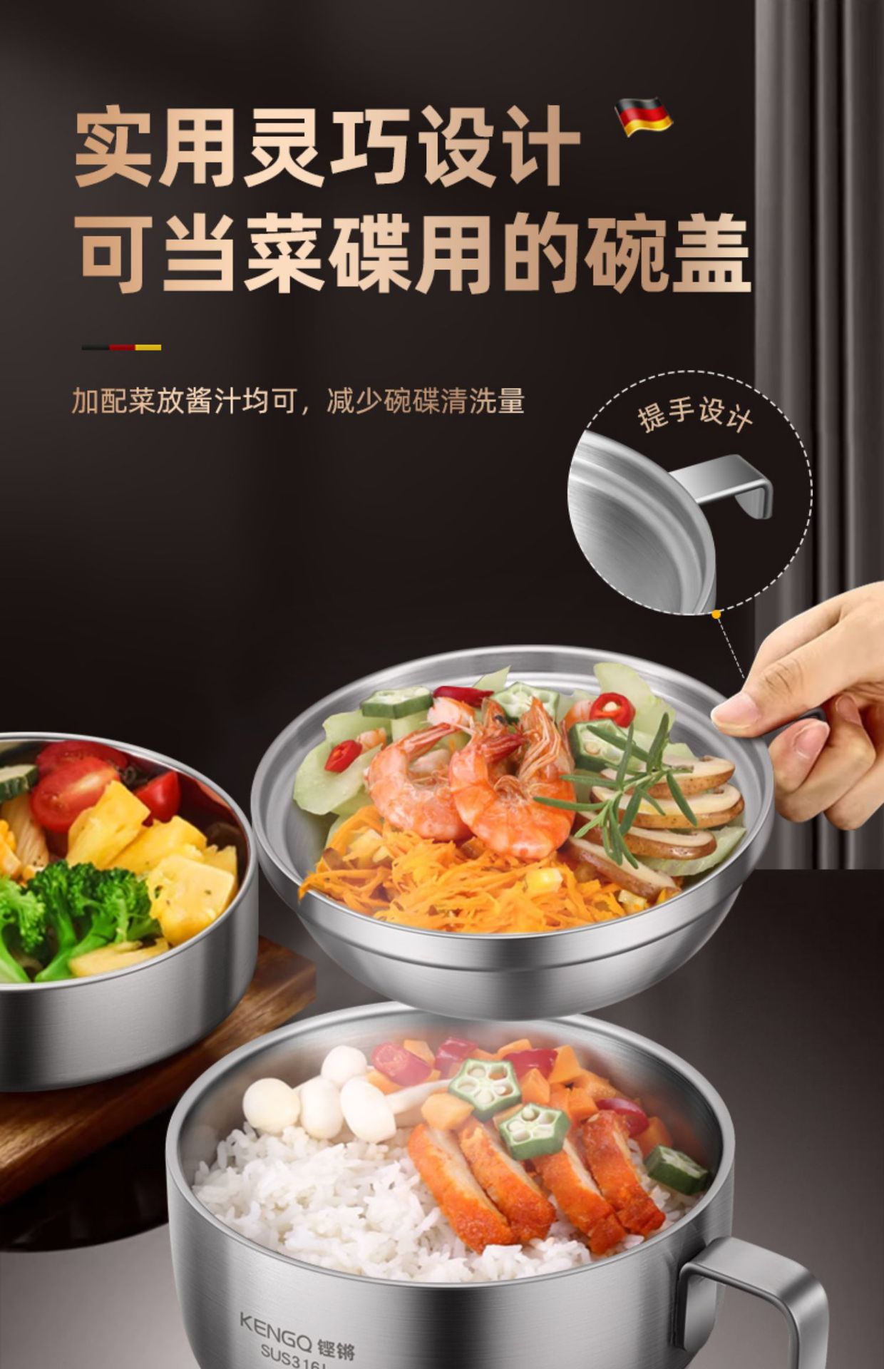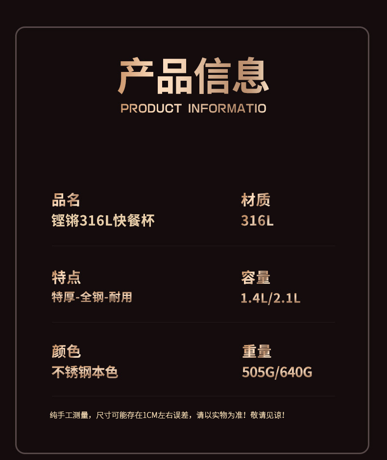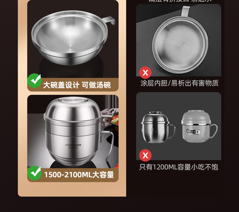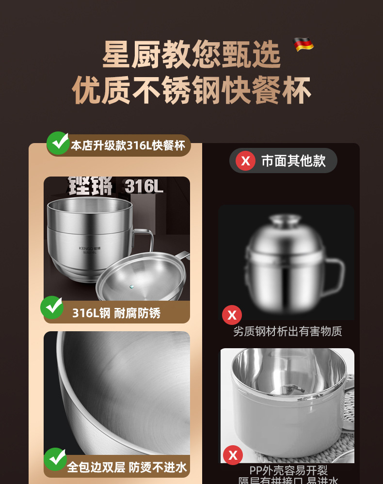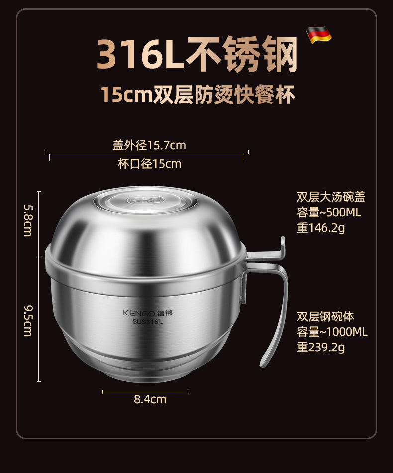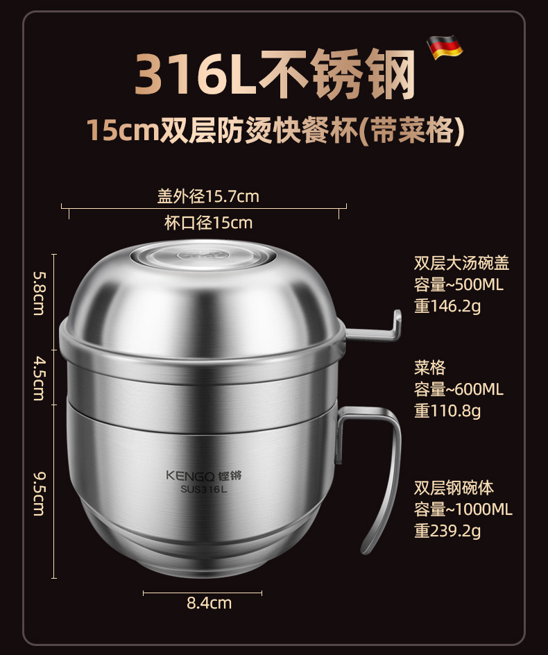 | Especificaciones | Tazón de arroz 316L + tazón de sopa 316L [acero 316L actualizado] Tazón de arroz 316L + compartimiento de platos 304 + tazón de sopa 316L [acero 316L actualizado] Tazón de arroz 316L + tazón de sopa 316L + cubiertos portátiles [acero 316L actualizado] Tazón de arroz 316L + compartimiento de platos 304 + tazón de sopa 316L + cubiertos portátiles [acero 316L actualizado] |