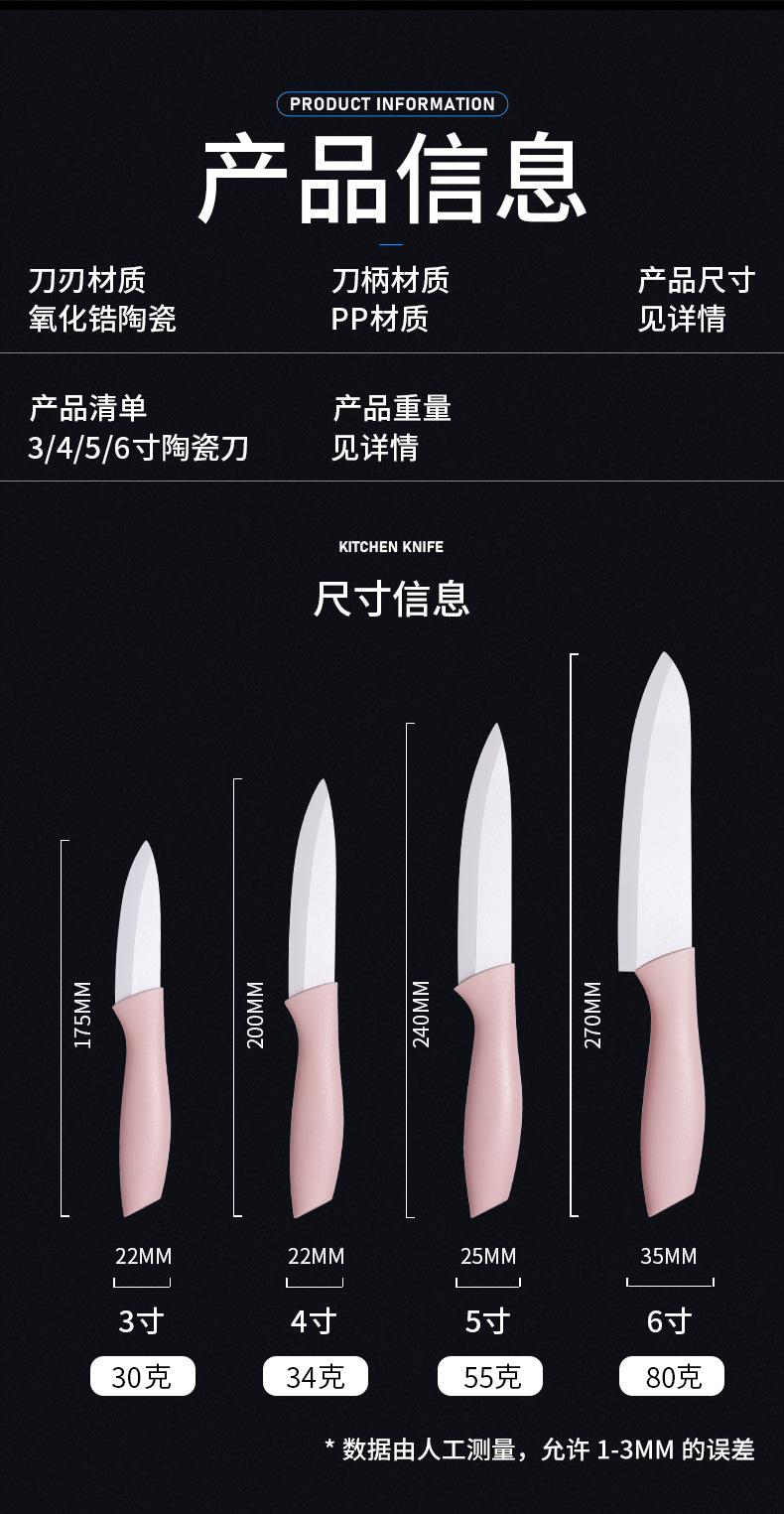 | Especificaciones | Cuchillo de frutas de cerámica de 3 pulgadas [con cubierta de cuchillo] Cuchillo de frutas de cerámica de 4 pulgadas [con cubierta de cuchillo] Cuchillo de frutas de cerámica de 5 pulgadas [con cubierta de cuchillo] Cuchillo de frutas de cerámica de 6 pulgadas [con cubierta de cuchillo] |