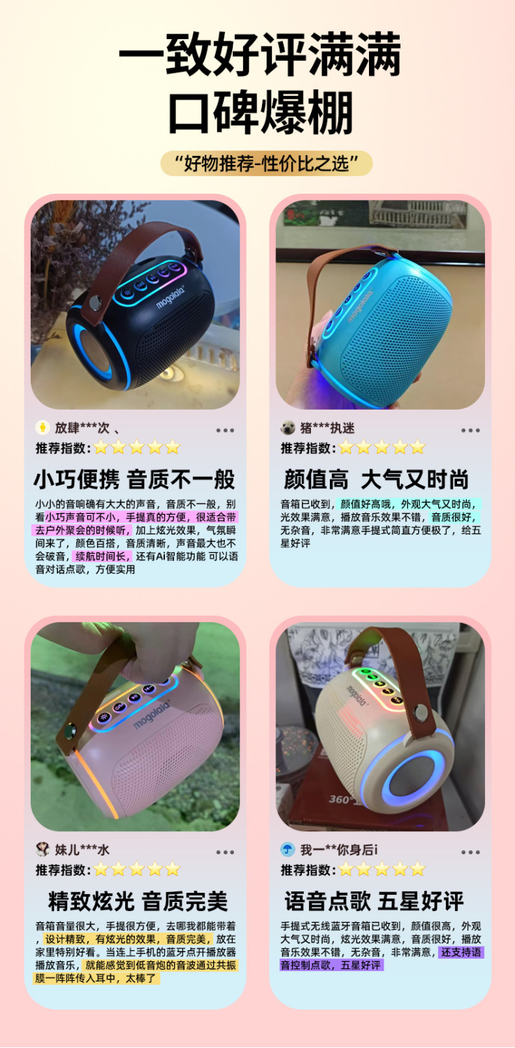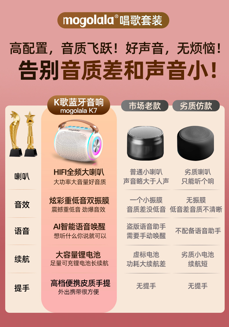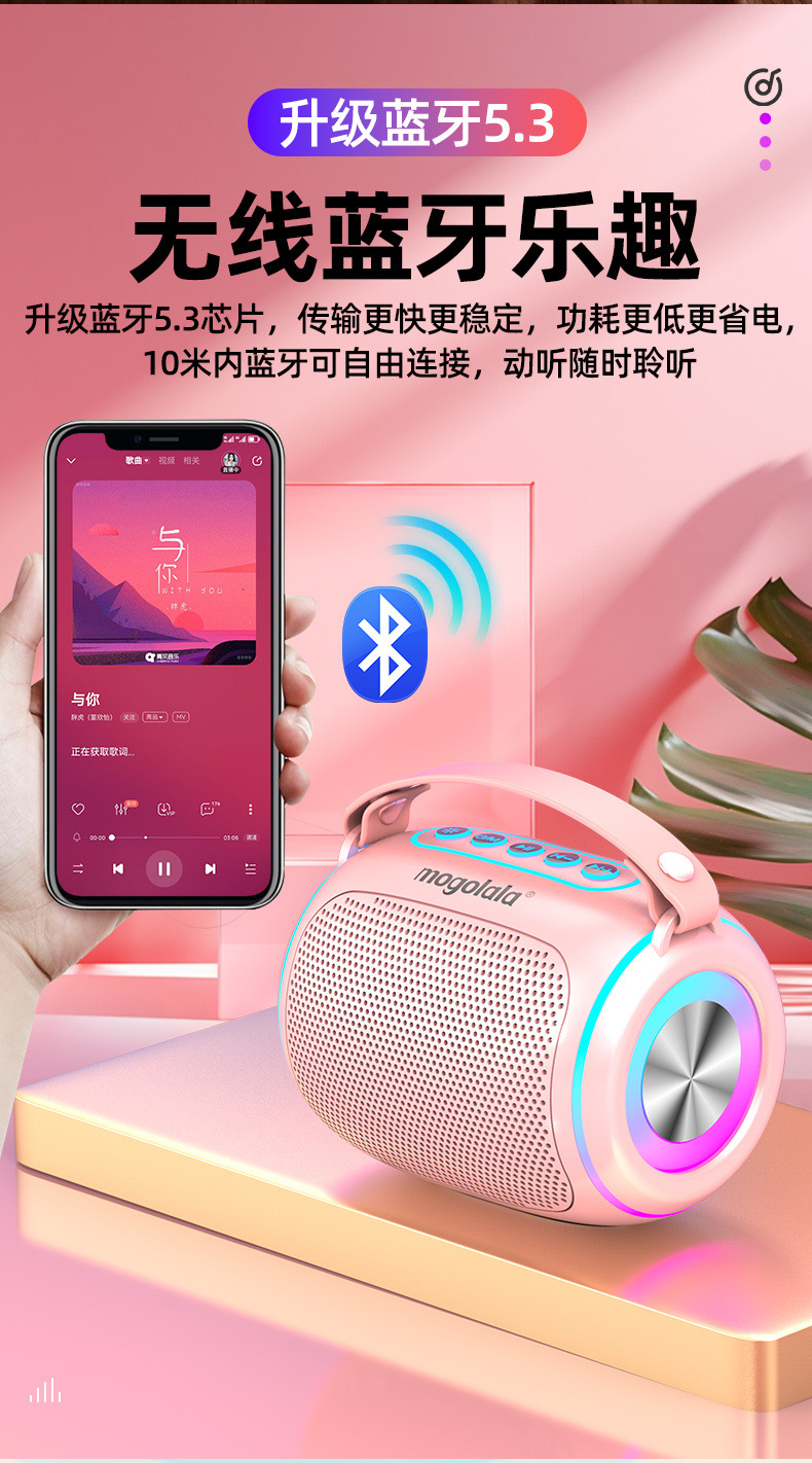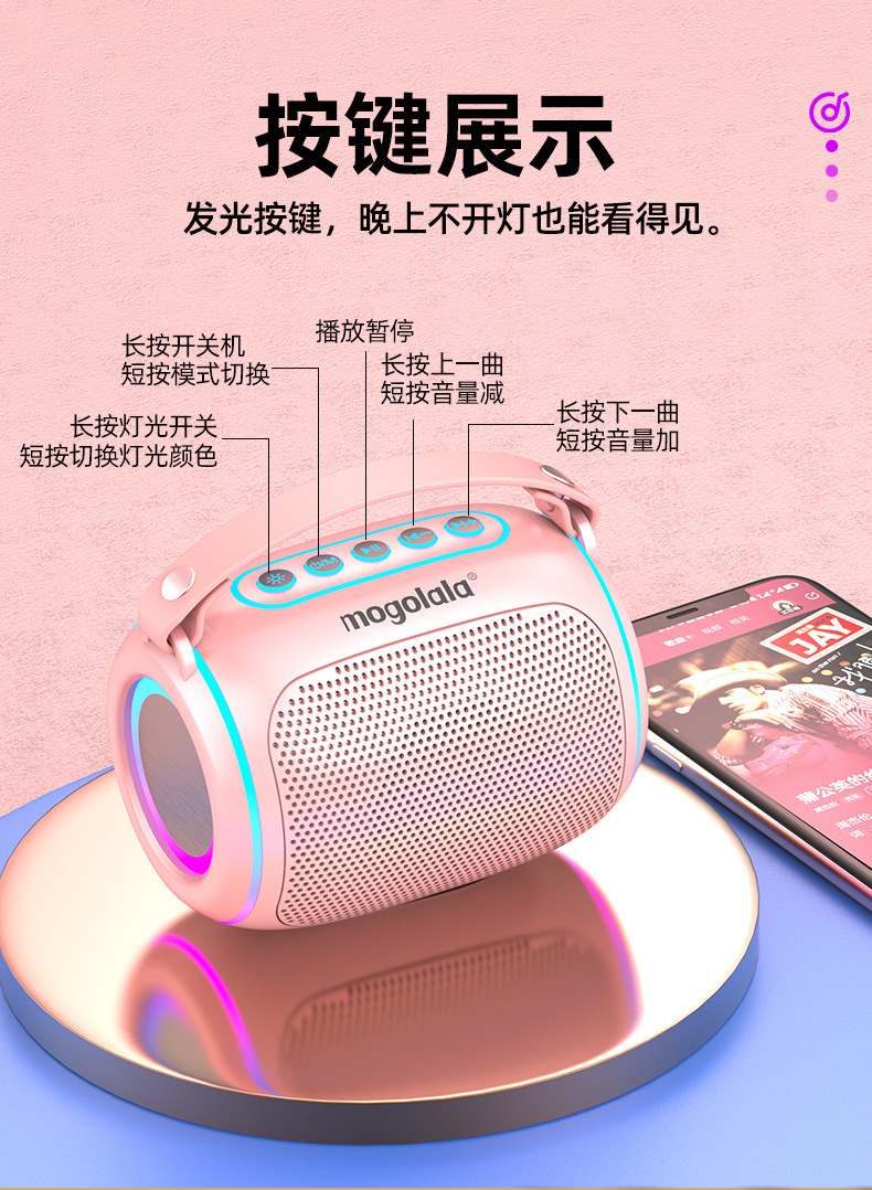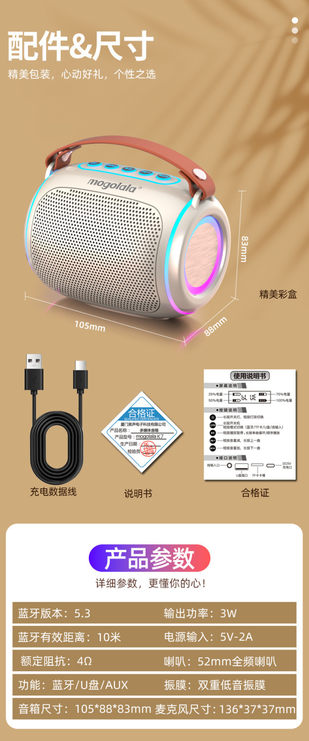 | Especificaciones | Versión baja: altavoz normal / sin mano, versión mejorada: altavoz normal + portátil, versión insignia: altavoz de alta definición + portátil de cuero + lámpara monocromática, versión de color brillante: altavoz de bajo + portátil de cuero + lámpara de colores fresca, versión de lujo: altavoz de bajo pesado + batería ultra grande + portátil + lámpara fresca |