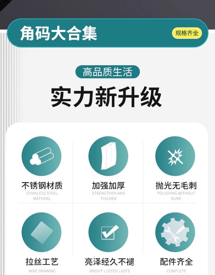 | Especificaciones | 1号L型19-10只,2号L型19-10只,3号L型24-20只,4号L型24-10只,5号L型29-20只,6号L型29-10只,7号L型39-20只,8号L型39-10只,9号L型45-4只,10号L型50-4只,11号L型65-4只,12号L型65-4只,13号L型80-4只,14号L型90-2只,15号L型100-2只,16号L型125-2只,17号L型125-4只,18号L型150-2只,19号L型150-1只,20号直角50-2只,21号直角65-2只,22号直角85-2只,23号直角3038-10只,24号直角白30-4只,25号直角黑30-4只,26号直角银30-4只,27号直角白40-4只,28号直角黑40-4只,29号直角40-2只,30号直角白50-4只,31号直角黑50-4只,32号直角50-2只,33号直角白70-4只,34号直角黑70-4只,35号直角70-2只,36号加长白78-4只,37号加长黑78-4只,38号加长78-4只,39号加长白97-4只,40号加长黑97-4只,41号加长97-4只,42号加长白137-4只,43号加长黑137-4只,44号加长137-4只,45号直条36-10只,46号直条35-10只,47号直条46-10只,48号直条45-10只,49号直条56-10只,50号直条55-10只,51号直条76-10只,52号直条75-10只,53号直条86-4只,54号直条124-4只,55号直条175-2只,56号直片57-4只,57号直片60-10只,58号直片80-2只,59号直片100-2只,60号直片140-2只,64号L码39-10只,65号L码50-10只,66号L码60-10只,67号L码80-10只,68号L码80-4只,69号L码120-1只,70号L码150-1只,71号L码内左-4只,72号L码外左-4只,73号L码内右-4只,74号L码外右-4只,75号T码40-10只,79号T码50-10只,80号T码60-10只,80号T码120-1只,81号T码80-10只,81号T码内装-4只,82号T码80-4只,82号T码外装-4只,83号反孔直角30-4只,84号反孔直角40-2只,85号反孔直角50-2只,86号反孔直角70-2只 |