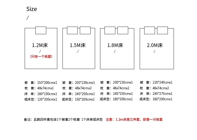 | Especificaciones de tamaño | 1.2m sábanas de tres piezas [aplicable a 150 * 200 edredones], 1.5m sábanas de cuatro piezas [aplicable a 200 * 230 edredones], 1.8m sábanas de cuatro piezas [aplicable a 200 * 230 edredones], 2m sábanas de cuatro piezas [aplicable a 220 * 240 edredones], 1.5m sábanas de cuatro piezas [aplicable a 200 * 230 edredones], 1.8m sábanas de cuatro piezas [aplicable a 200 * 230 edredones] |