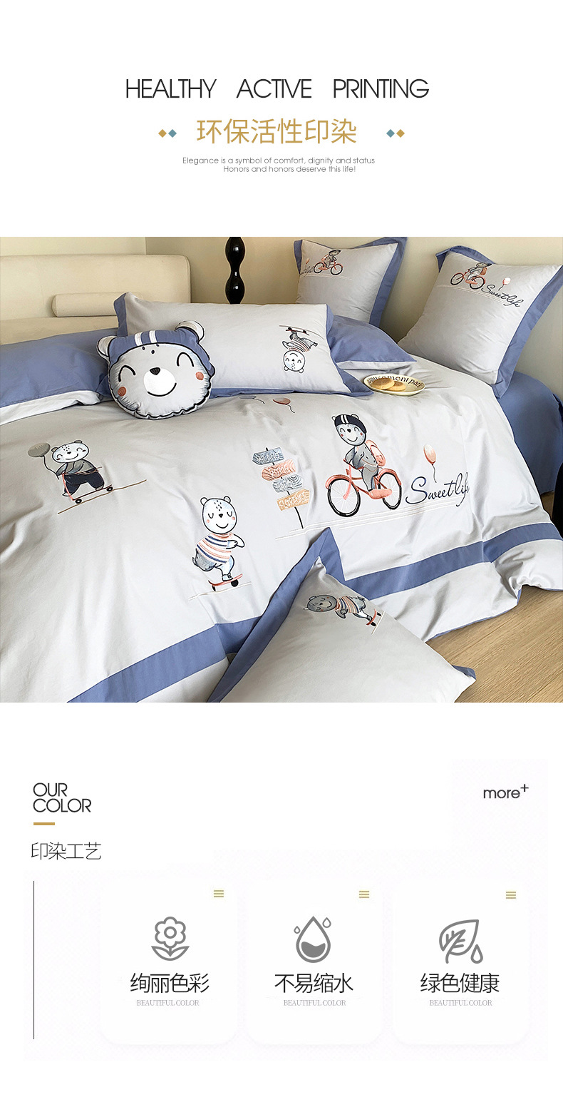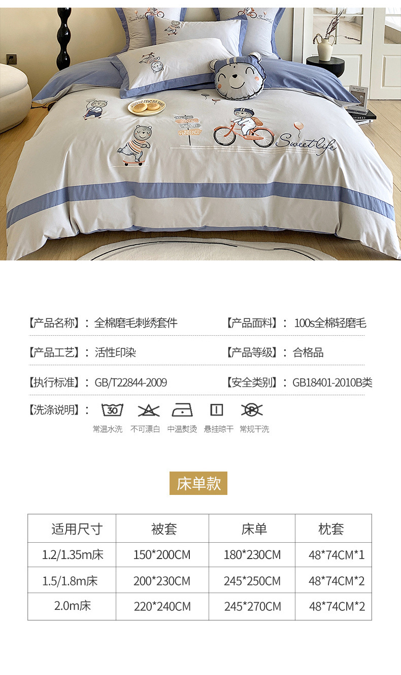 | Especificaciones de tamaño | Set de sábanas de 0.9 - 1.2m de tres piezas [aplicable a núcleo de edredón de 150 * 200cm], set de sábanas de 1.5m de cuatro piezas [aplicable a núcleo de edredón de 200 * 230cm], set de sábanas de 1.8m de cuatro piezas [aplicable a núcleo de edredón de 200 * 230cm], set de sábanas de 2.0m de cuatro piezas [aplicable a núcleo de edredón de 220 * 240cm] |