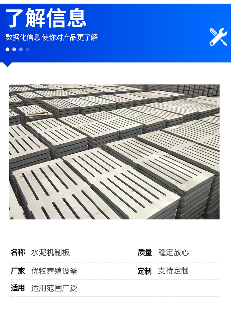 | Especificaciones del producto | 1.2 Placa de cemento 1.2 * 0.6 * 0.07 m, 1.5 m tablero de cemento 1.5 * 0.6 * 0.07 metros, 2 metros de placa de fugas mecánicas 2 * 0.6 * 0.1 m, placa de fugas mecánicas de 2,2 m 2.2 * 0.6 * 0.1 m, 2.4 m mecanismo de placa de fugas de heces 2.4 * 0.6 * 0.1 m, 2.6 m mecanismo de placa de fugas de heces 2.6 * 0.6 * 0.1 m, 2,8 m con agujeros de la placa de fugas de estiércol 2.8 * 0.65 * 0.11 m, tablero de fugas mecánicas de 2.8 m 2.8 * 0.63 * 0.11 m, placa de 3 m 3 * 0.6 * 0.11m, 3m con placa de agujero de observación 3 * 0.6 * 0.11 m, 1 m de placa de ganado 1 * 0.6 * 0.1, tablero de ganado de 1.3 m 1.3 * 0.6 * 0.1, 1.5 m placa de ganado 1.5 * 0.6 * 0.1, 1.8m placa de ganado 1.8 * 0.6 * 0.1 |