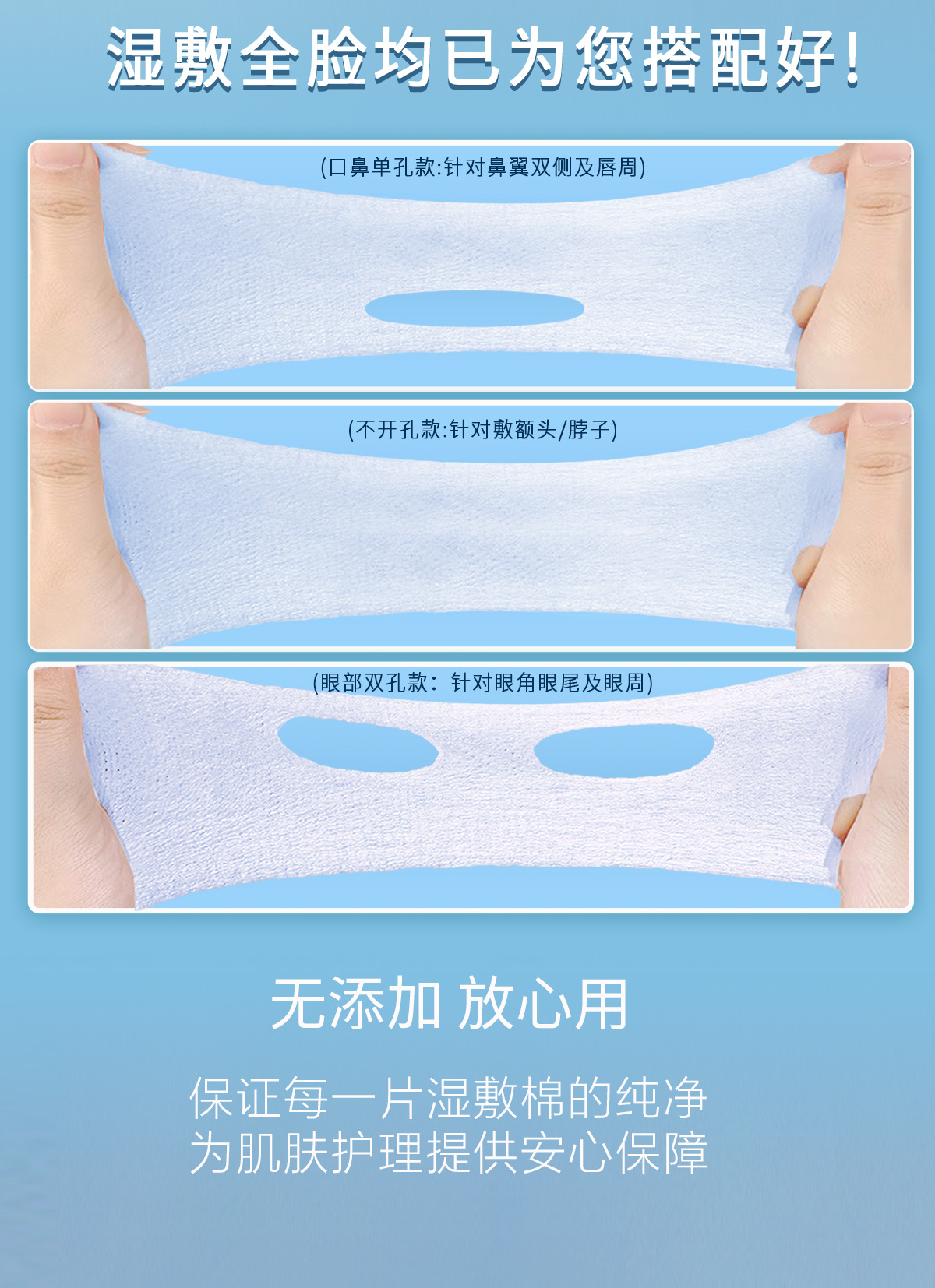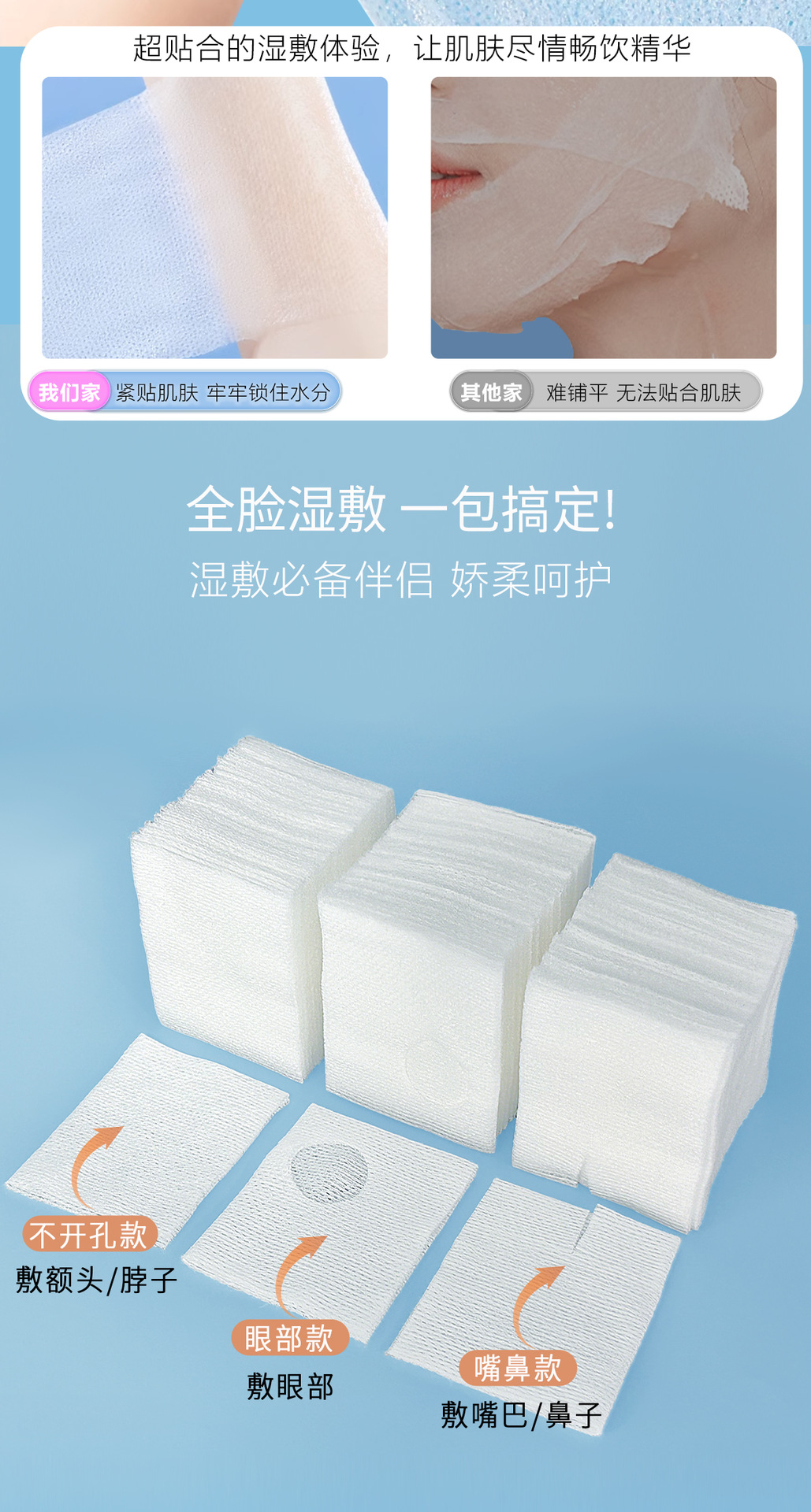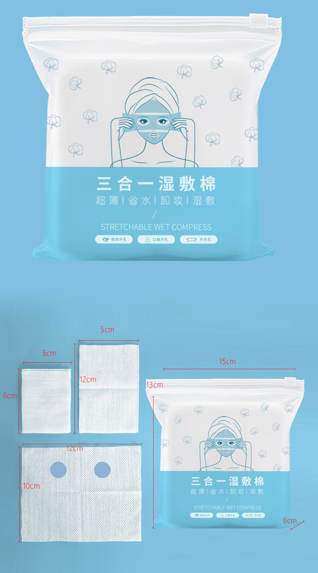 | Especificaciones | Compresa húmeda de algodón tres en uno (80 piezas sin agujeros + 80 piezas para ojos + 80 piezas para boca y nariz) 240 piezas,Compresa húmeda de algodón tres en uno (70 piezas sin agujeros + 70 piezas para ojos + 70 piezas para boca y nariz) 210 piezas,Compresas húmedas de algodón sin agujeros, 200 unidades. |