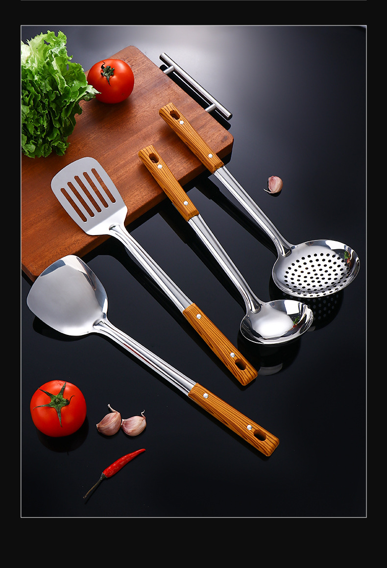 Juego de utensilios de cocina de acero inoxidable para cocinar aislamiento térmico engrosado mango de grano de madera espátula colador cuchara de sopa al por mayor utensilios de cocina domésticos